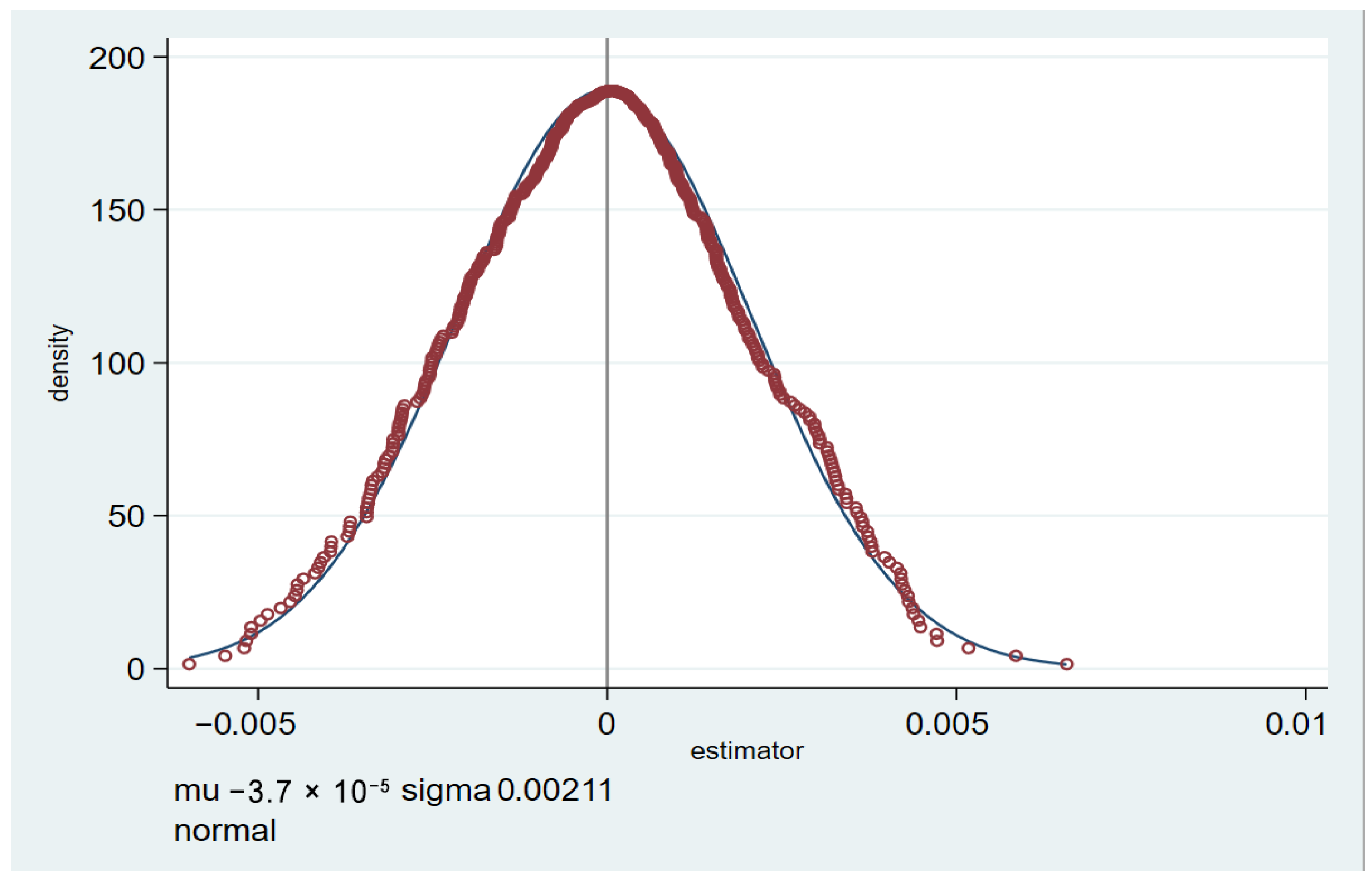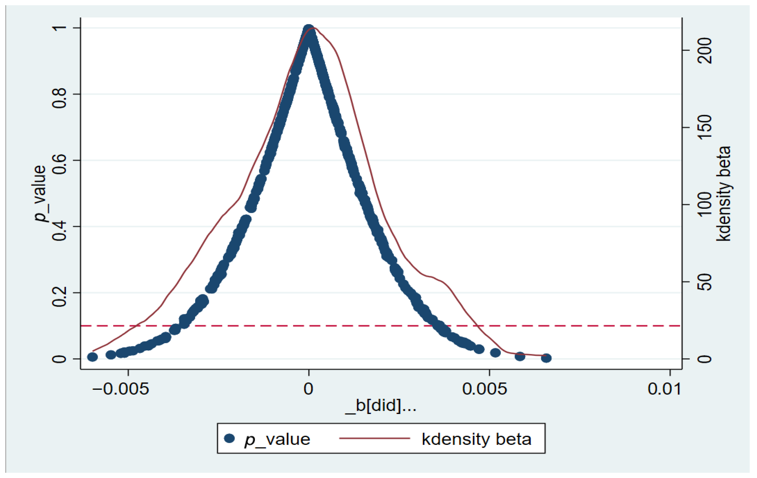 In order to investigate whether the reduction in financial leverage is purely caused by time variation, and to eliminate the potential interference of unobserved firm sample characteristics on the regression analysis, this paper randomly selects 123 observations in the overall sample as the “simulated experimental group”, and to ensure the reliability of the results, repeats this random sampling process a total of 500 times, and then conducts regression. In order to ensure the reliability of the results, this random sampling process is repeated for a total of 500 times, and then regression is performed. The distribution of the coefficients of the regression results is shown in Figure 2, and the p-value image is shown in Figure 3.
