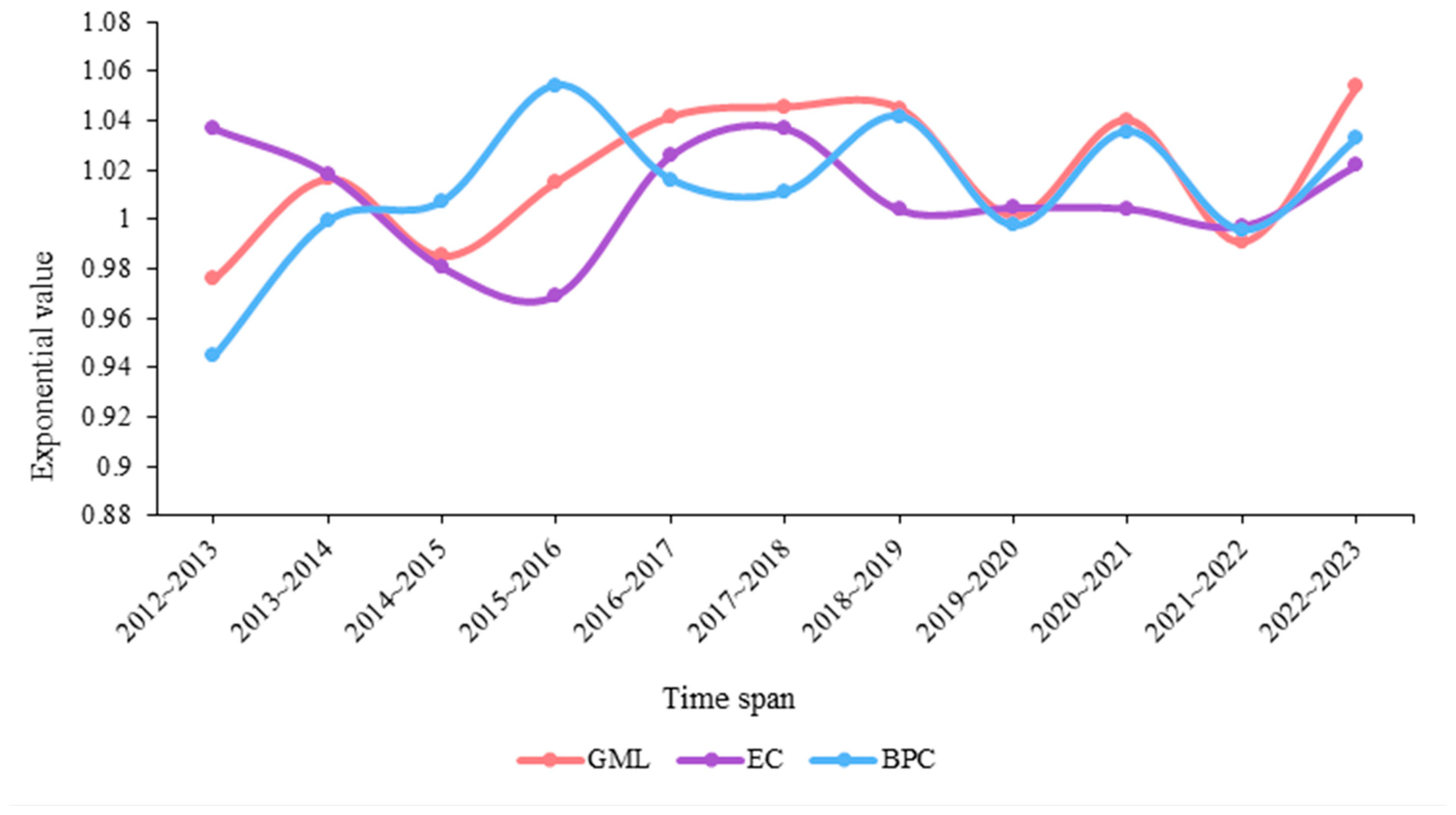 - The decomposition analysis of the GML index indicates that the BPC curve aligns more closely with the GML trend. In most years, the BPC values exceed EC values, which indicates that technological progress is the primary driver of the GTFP improvement in China’s electric power industry.