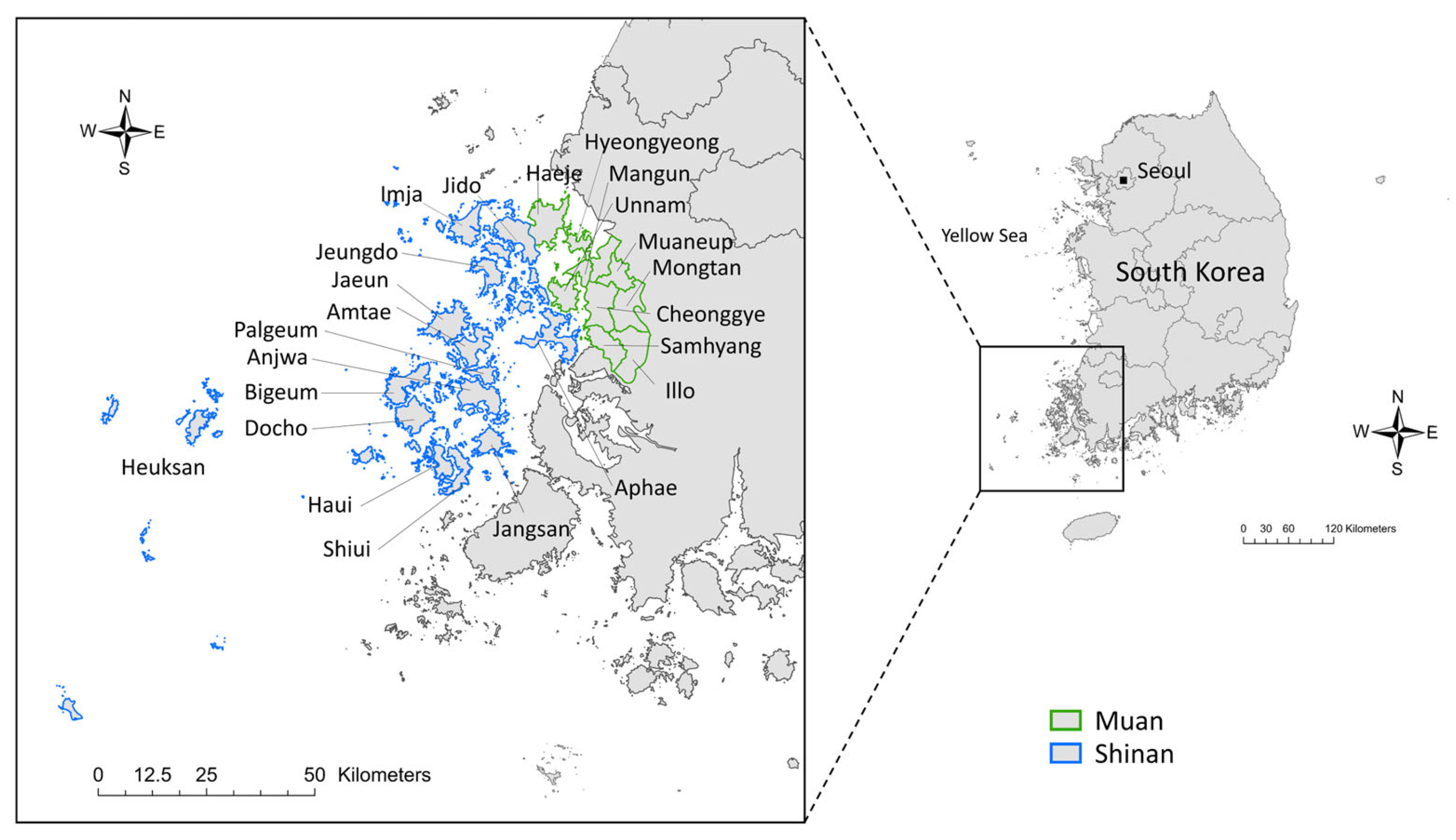 | Geographical features | North–south elongated terrain; most hills 200–300 m above sea level; extensive reclaimed tidal flats converted to cropland since the 1960s | 2 eups and 12 myeons (14 local offices) Composed of ~890 islands; mostly rolling hills 200–300 m above sea level; broad tidal flats |