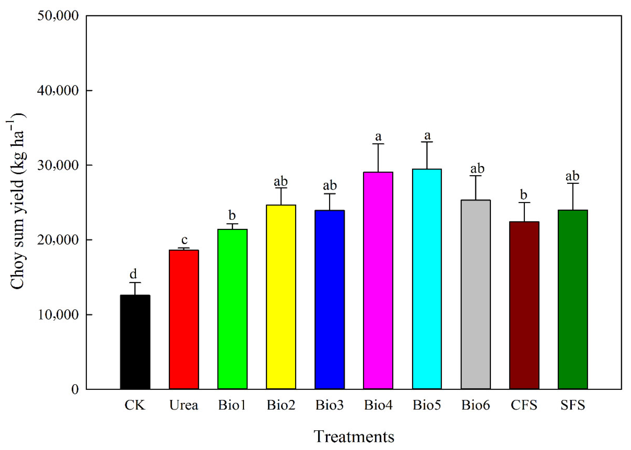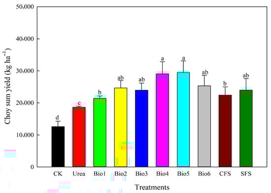 Effect of carbon-based stabilized coated urea on choy sum yield. Values are means ± standard error (n = 3). Different lowercase letters on the bar indicate significant differences based on the LSD method (p < 0.05). Bio1, biochar only; Bio2, 0.5% NBPT; Bio3, 1.0% DCD; Bio4, 0.5% NBPT + 1.0% DCD; Bio5, 0.5% NBPT + 1.5% DCD; Bio6, 1.0% NBPT + 1.5% DCD; CFS, controlled-release fertilizer; and SFS, slow-release fertilizer.