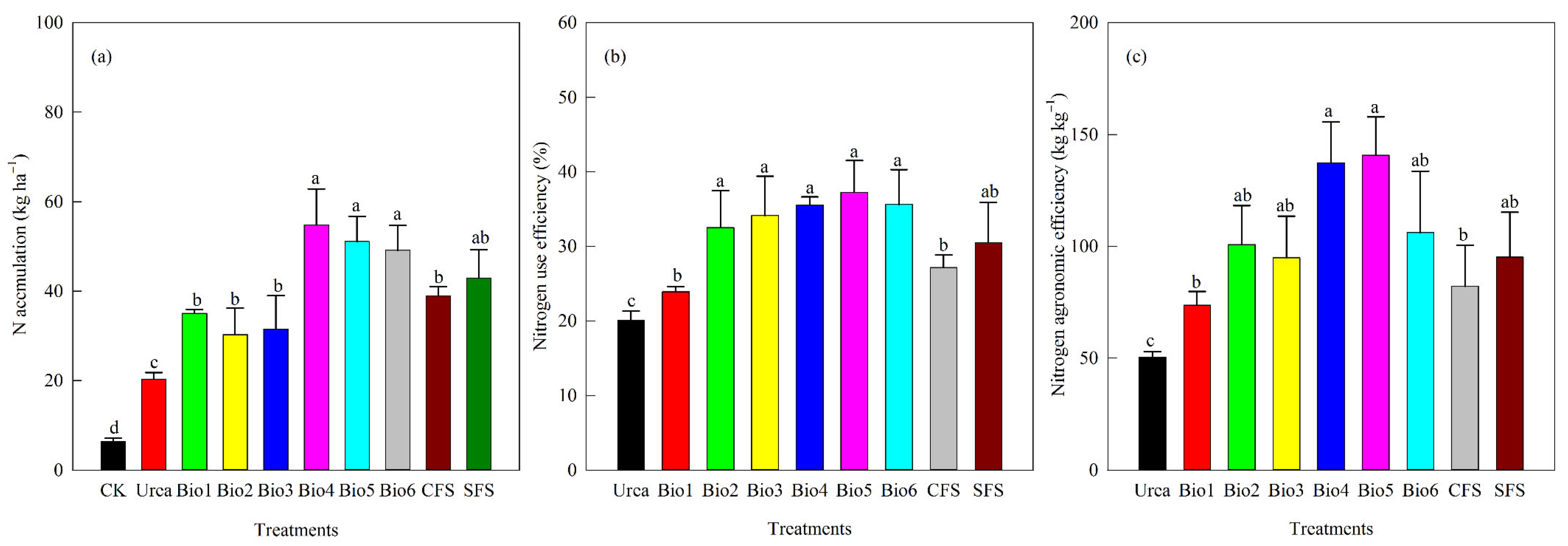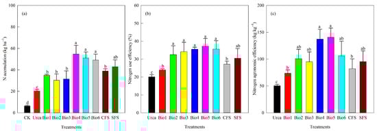 Effect of carbon-based stabilized coated urea on (a) N accumulation; (b) N use efficiency; and (c) agronomic efficiency. Values are means ± standard error (n = 3). Different lowercase letters on the bar indicate significant differences based on the LSD method (p < 0.05). Bio1, biochar only; Bio2, 0.5% NBPT; Bio3, 1.0% DCD; Bio4, 0.5% NBPT + 1.0% DCD; Bio5, 0.5% NBPT + 1.5% DCD; Bio6, 1.0% NBPT + 1.5% DCD; CFS, controlled-release fertilizer; and SFS, slow-release fertilizer.