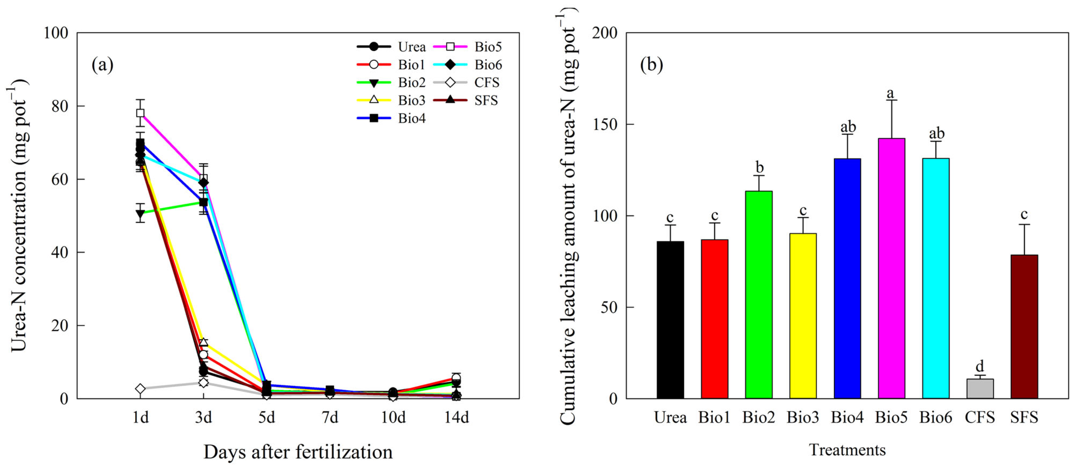 Effect of carbon-based stabilized coated urea on urea-N (a) per event and (b) cumulative. Values are means ± standard error (n = 3). Different lowercase letters on the bar indicate significant differences based on the LSD method (p < 0.05). Bio1, biochar only; Bio2, 0.5% NBPT; Bio3, 1.0% DCD; Bio4, 0.5% NBPT + 1.0% DCD; Bio5, 0.5% NBPT + 1.5% DCD; Bio6, 1.0% NBPT + 1.5% DCD; CFS, controlled-release fertilizer; and SFS, slow-release fertilizer.