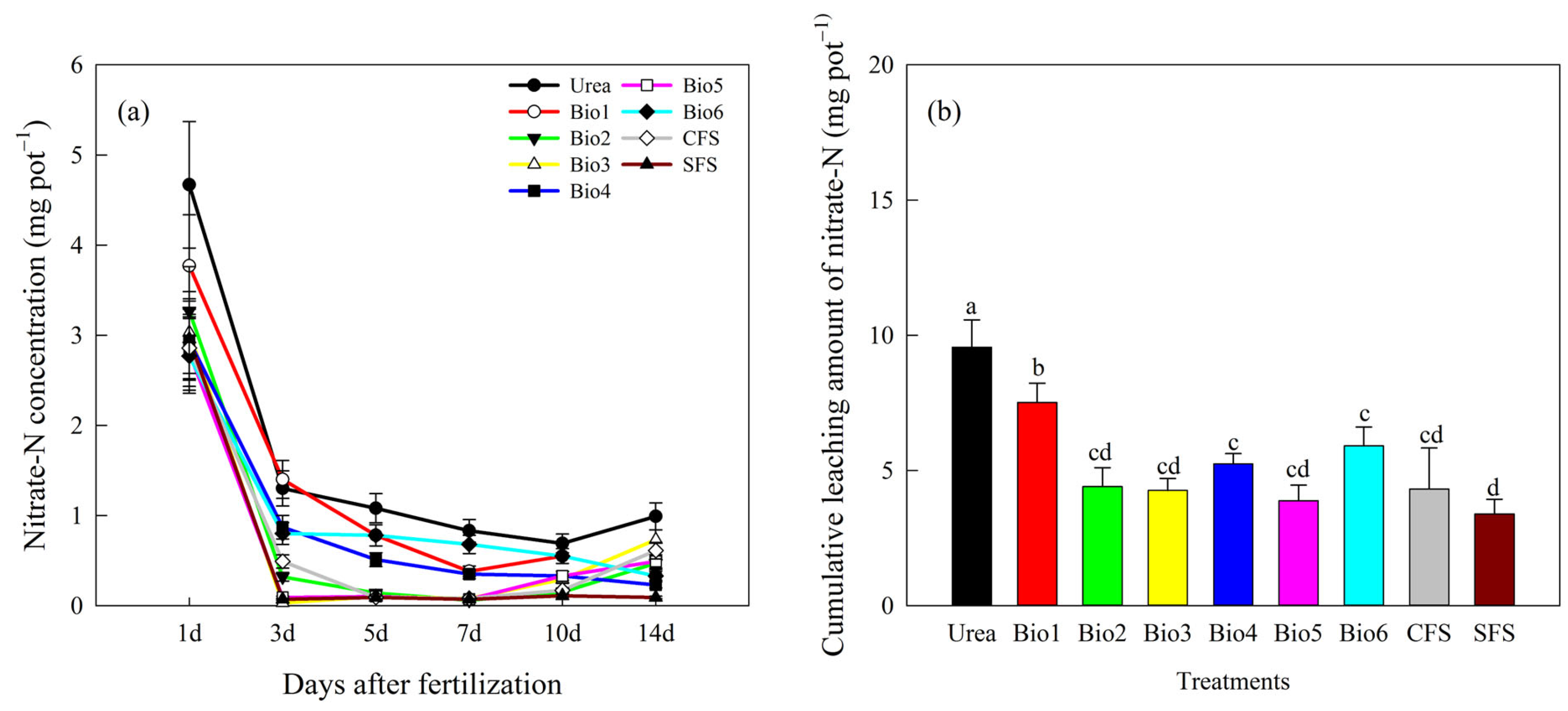 Effect of carbon-based stabilized coated urea on nitrate-N leaching (a) per event and (b) cumulative. Values are means ± standard error (n = 3). Different lowercase letters on the bar indicate significant differences based on the LSD method (p < 0.05). Bio1, biochar only; Bio2, 0.5% NBPT; Bio3, 1.0% DCD; Bio4, 0.5% NBPT + 1.0% DCD; Bio5, 0.5% NBPT + 1.5% DCD; Bio6, 1.0% NBPT + 1.5% DCD; CFS, controlled-release fertilizer; and SFS, slow-release fertilizer.