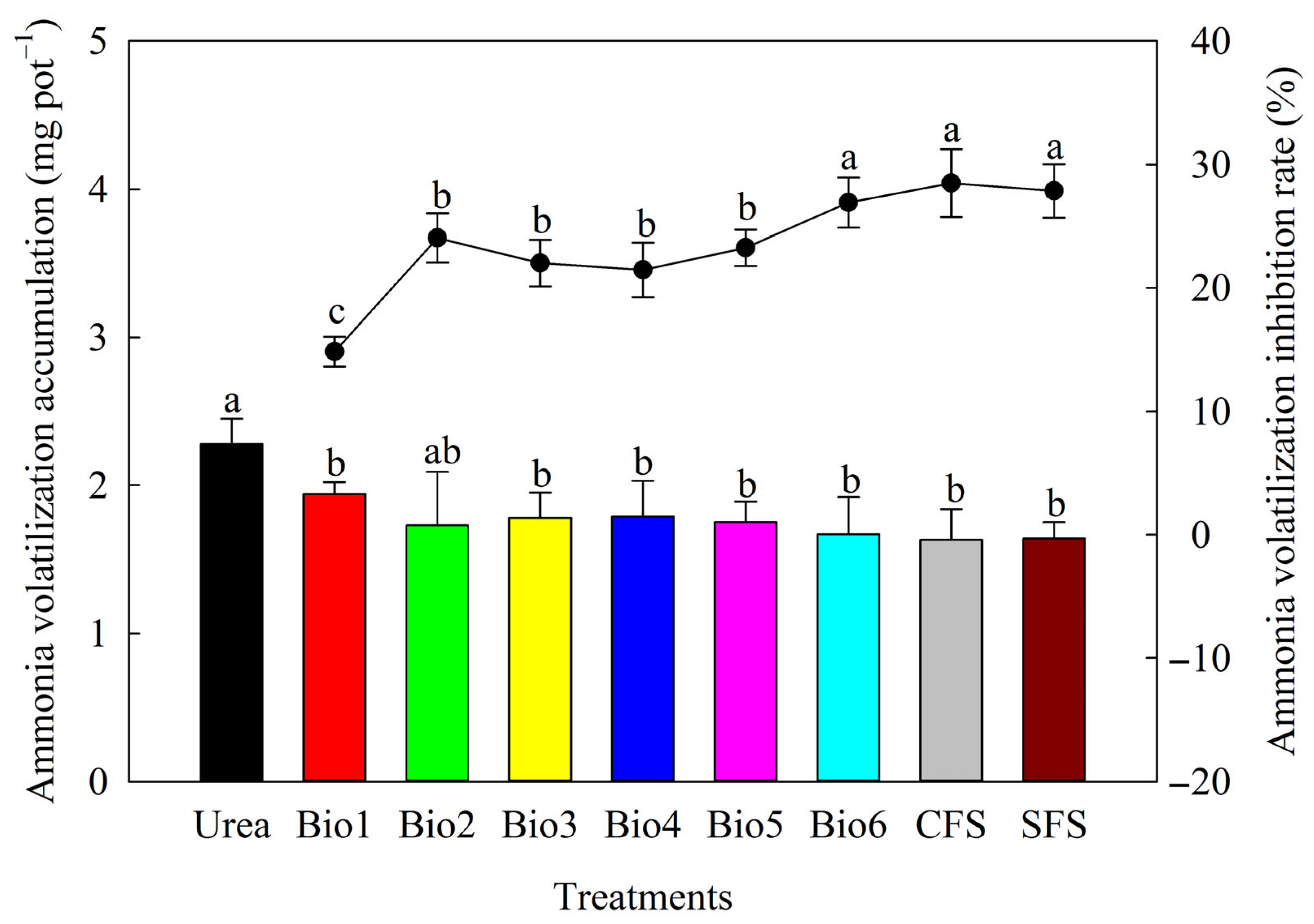 Effect of carbon-based stabilized coated urea on ammonia volatilization accumulation and its inhibition rate. Values are means ± standard error (n = 3). Different lowercase letters on the bar or line indicate significant differences based on the LSD method (p < 0.05). Bio1, biochar only; Bio2, 0.5% NBPT; Bio3, 1.0% DCD; Bio4, 0.5% NBPT + 1.0% DCD; Bio5, 0.5% NBPT + 1.5% DCD; Bio6, 1.0% NBPT + 1.5% DCD; CFS, controlled-release fertilizer; and SFS, slow-release fertilizer.