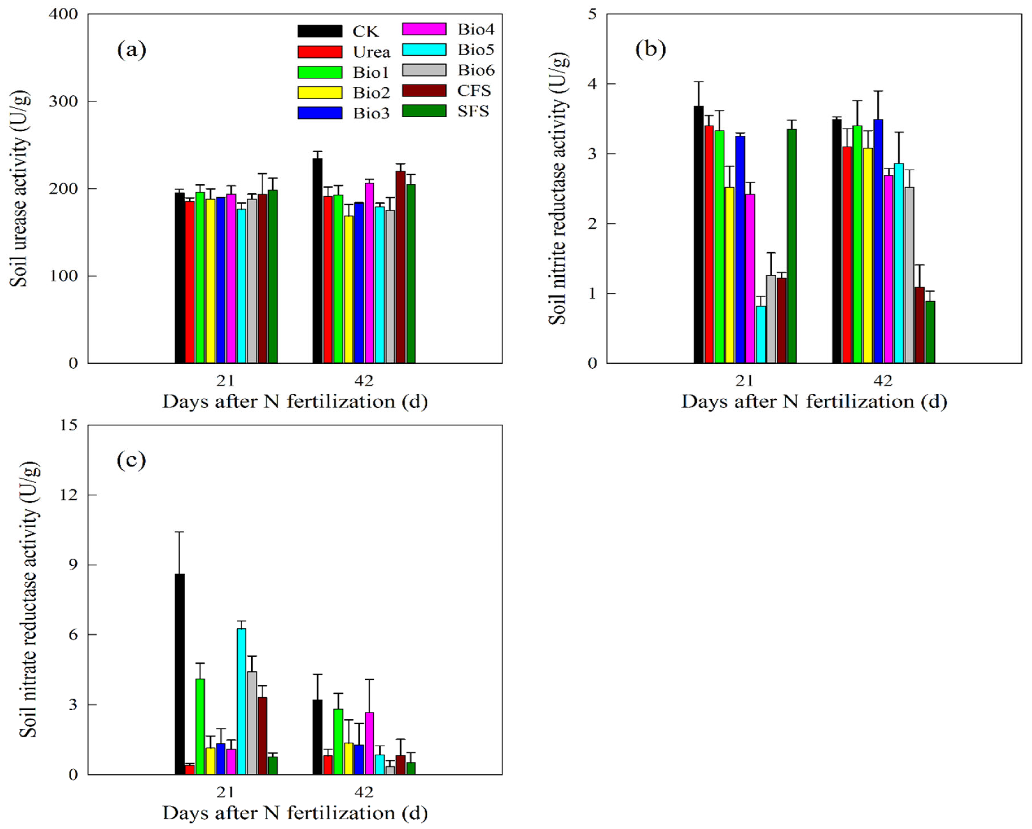 Effect of carbon-based stabilized coated urea on soil (a) urease; (b) nitrite; and (c) nitrate activities. Values are means ± standard error (n = 3). Bio1, biochar only; Bio2, 0.5% NBPT; Bio3, 1.0% DCD; Bio4, 0.5% NBPT + 1.0% DCD; Bio5, 0.5% NBPT + 1.5% DCD; Bio6, 1.0% NBPT + 1.5% DCD; CFS, controlled-release fertilizer; and SFS, slow-release fertilizer. The units of the three enzymes are uniformly expressed as U/g, representing the quantity of enzyme necessary to catalyze the conversion of 1 μmol of substrate per minute under optimal conditions (25 °C).