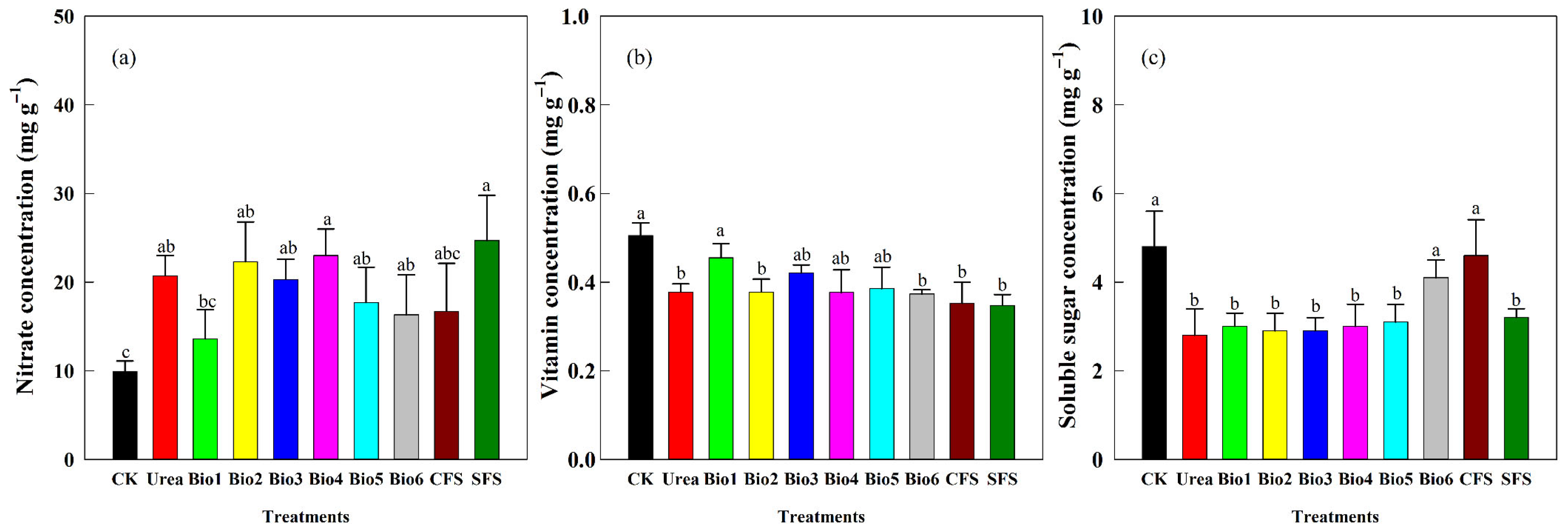 Effect of carbon-based stabilized coated urea on (a) nitrate; (b) vitamin; and (c) soluble sugar concentrations of choy sum quality. Values are means ± standard error (n = 3). Different lowercase letters on the bar indicate significant differences based on the LSD method (p < 0.05). Bio1, biochar only; Bio2, 0.5% NBPT; Bio3, 1.0% DCD; Bio4, 0.5% NBPT + 1.0% DCD; Bio5, 0.5% NBPT + 1.5% DCD; Bio6, 1.0% NBPT + 1.5% DCD; CFS, controlled-release fertilizer; and SFS, slow-release fertilizer.
