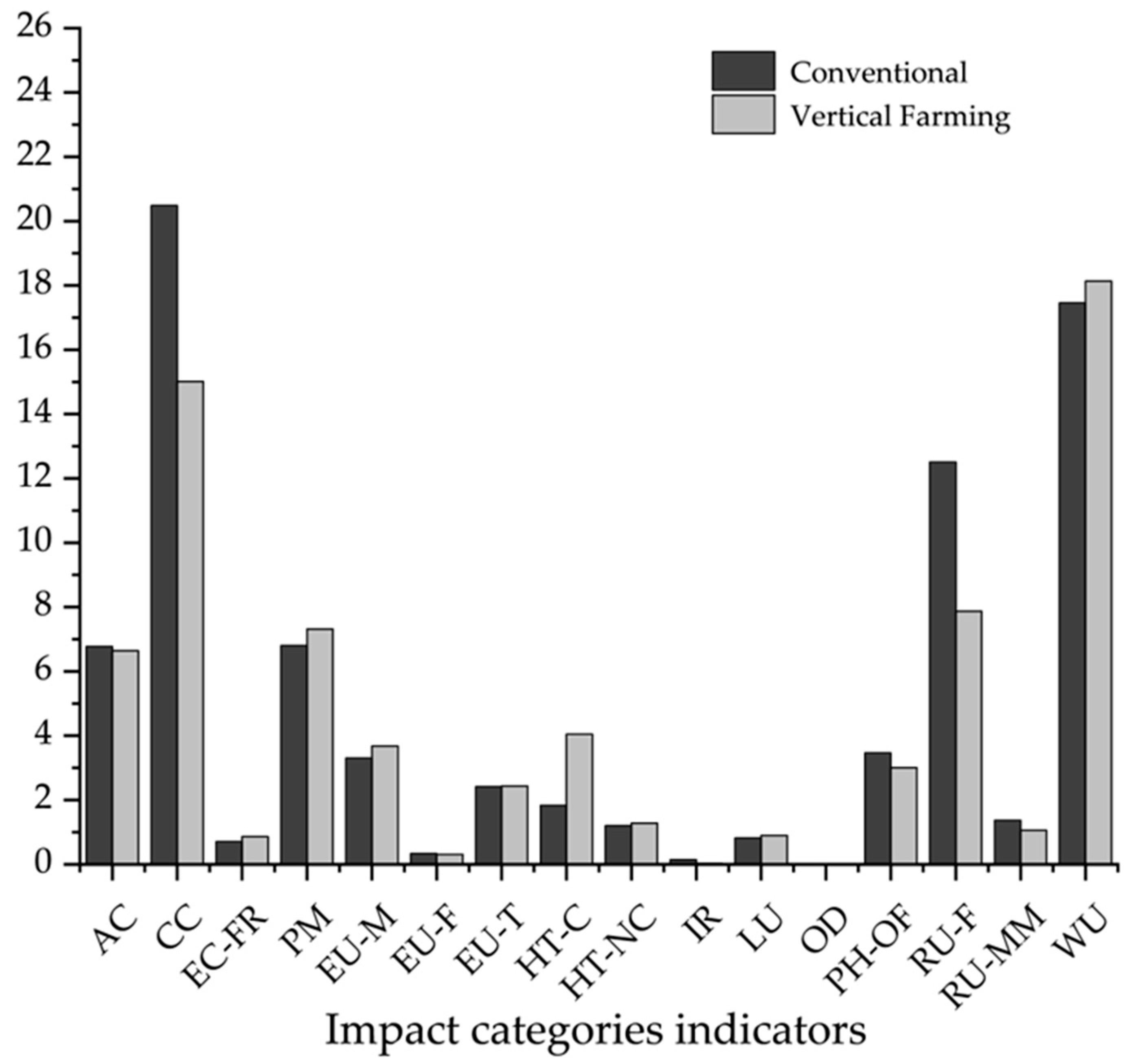 | Impact Category | Unit | Absolute Values | Relative Values | ||