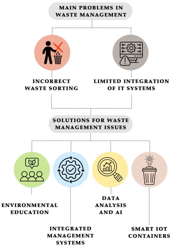 Addressing these challenges requires coordinated improvements in both organizational and technological areas. Environmental education can strengthen correct segregation practices and increase public awareness. Integrated management systems support smoother coordination between different actors in the waste sector. Data analysis and artificial intelligence improve forecasting and operational decision-making. Smart IoT containers provide real-time information on waste levels and help optimize collection schedules. These problems and their main solution pathways are illustrated in Figure 3.
