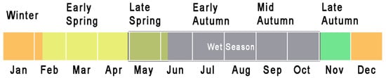 - Xie, M.E.; Yao, Y.; Peng, Q.Y. Study on the Seasonal Variations of the Climate in Low-Latitude Plateaus: A Case Study of Kunming and Dali in Yunnan Province. J. Trop. Meteorol. 2023, 39, 171–182. [Google Scholar]
