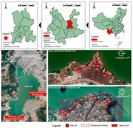 To address these gaps, this study selects South Dian Lake National Wetland Park and Laoyu Lake National Wetland Park in Kunming, Southwest China, as case study sites. Both parks are located on the shores of Dian Lake in a subtropical plateau monsoon climate, share similar macro-climatic and hydrological conditions, and are designated national wetland parks with high wetland coverage. At the same time, they differ in spatial layout, restoration stage, and plant community structure, representing two similar but contrasting models of large-scale wetland restoration around Dian Lake. These characteristics make them suitable for examining how plant color composition and seasonal dynamics are associated with public perception under comparable climatic conditions but distinct landscape configurations.