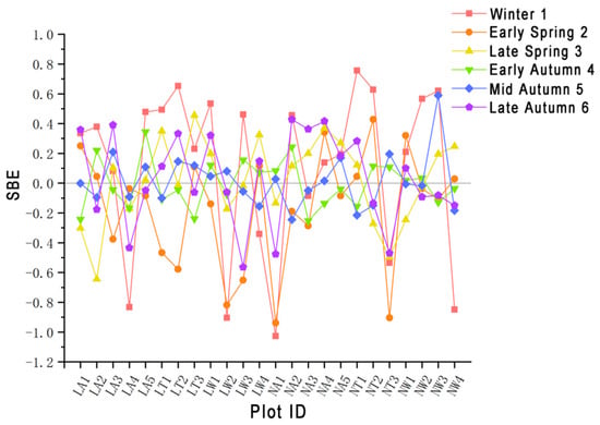This study employed traditional standardization to compute SBE values for 24 sample plots in Kunming National Wetland Park across six surveys (Figure 7). Results showed SBE values ranging from −1.027 to 0.756 (average: 0.000), indicating average plant landscape aesthetic quality. Winter SBE values fluctuated markedly, with substantial high–low differences, indicating that most plant landscapes in the park were favored by the public. This may stem from the strong visual impact of colored-leaf plants. However, several plots scored extremely low, indicating poor quality. In early spring, SBE values largely turned negative, with few plots positive. Plant dormancy resulted in low-saturation gray-brown dominance, while lacking hue contrast and delayed phenology suppressed expressiveness. SBE values stabilized during late spring, early autumn and mid-autumn, with minimal seasonal fluctuations. Kunming’s mild climate maintained stable yellow–green colors in wetland plants from May to September, resulting in consistent phenology. Aesthetic appeal then depended more on structural layering than hue variation. However, yellow–green uniformity reduced diversity and contrast, diminishing public preferences. In late autumn, SBE values rebounded with noticeable fluctuations, driven by autumn-colored plants expanding warm tones. Hue shifts enhanced layering and alleviated prior monotony.