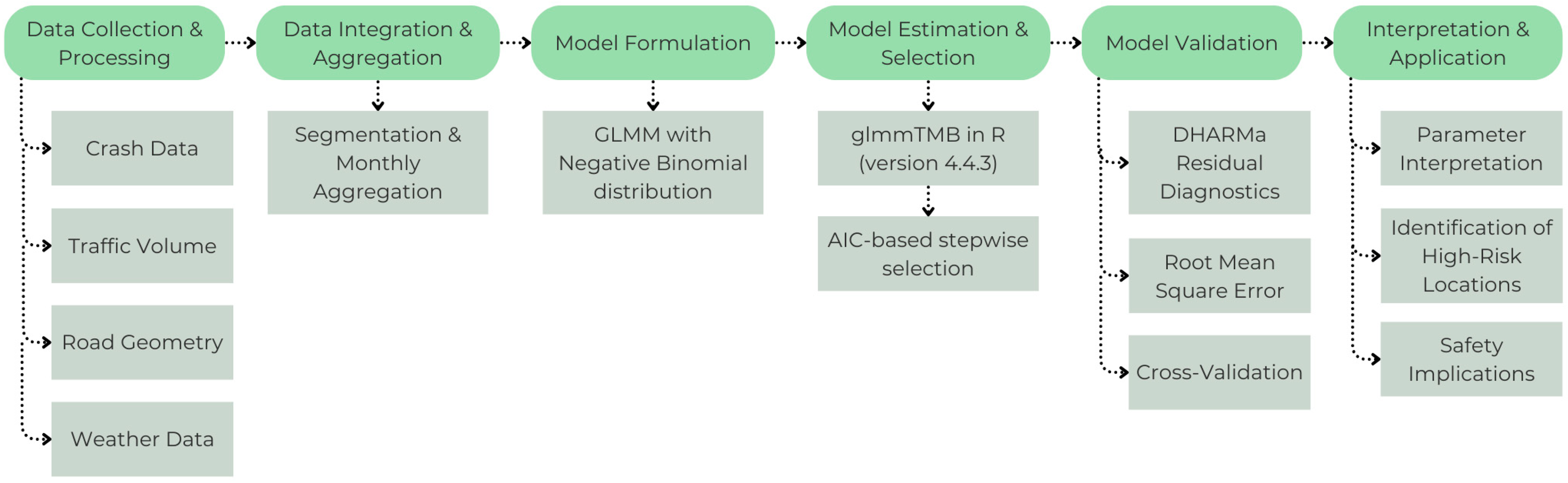 The methodological framework adopted in this study aims to model the relationship between crash frequency and explanatory variables associated with traffic exposure, roadway geometry, and weather conditions along the BR-116/SP highway segment between km 485 and km 542. The analysis was conducted using a Generalized Linear Mixed Modeling (GLMM) approach, which allows the incorporation of both fixed and random effects to account for unobserved heterogeneity across road segments and time periods. The overall methodological framework is summarized in Figure 1.