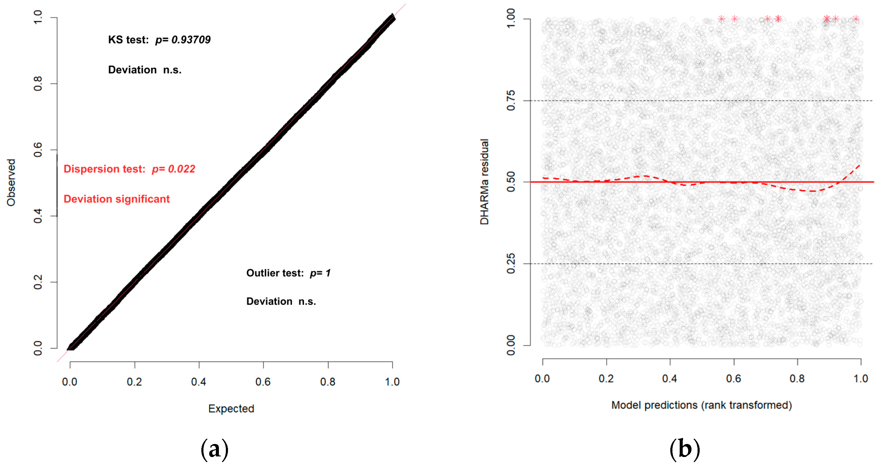 - Hartig, F. DHARMa: Residual Diagnostics for Hierarchical (Multi-Level/Mixed) Models. Version 0.4.7, 2024. Available online: https://cran.r-project.org/package=DHARMa (accessed on 28 September 2025).