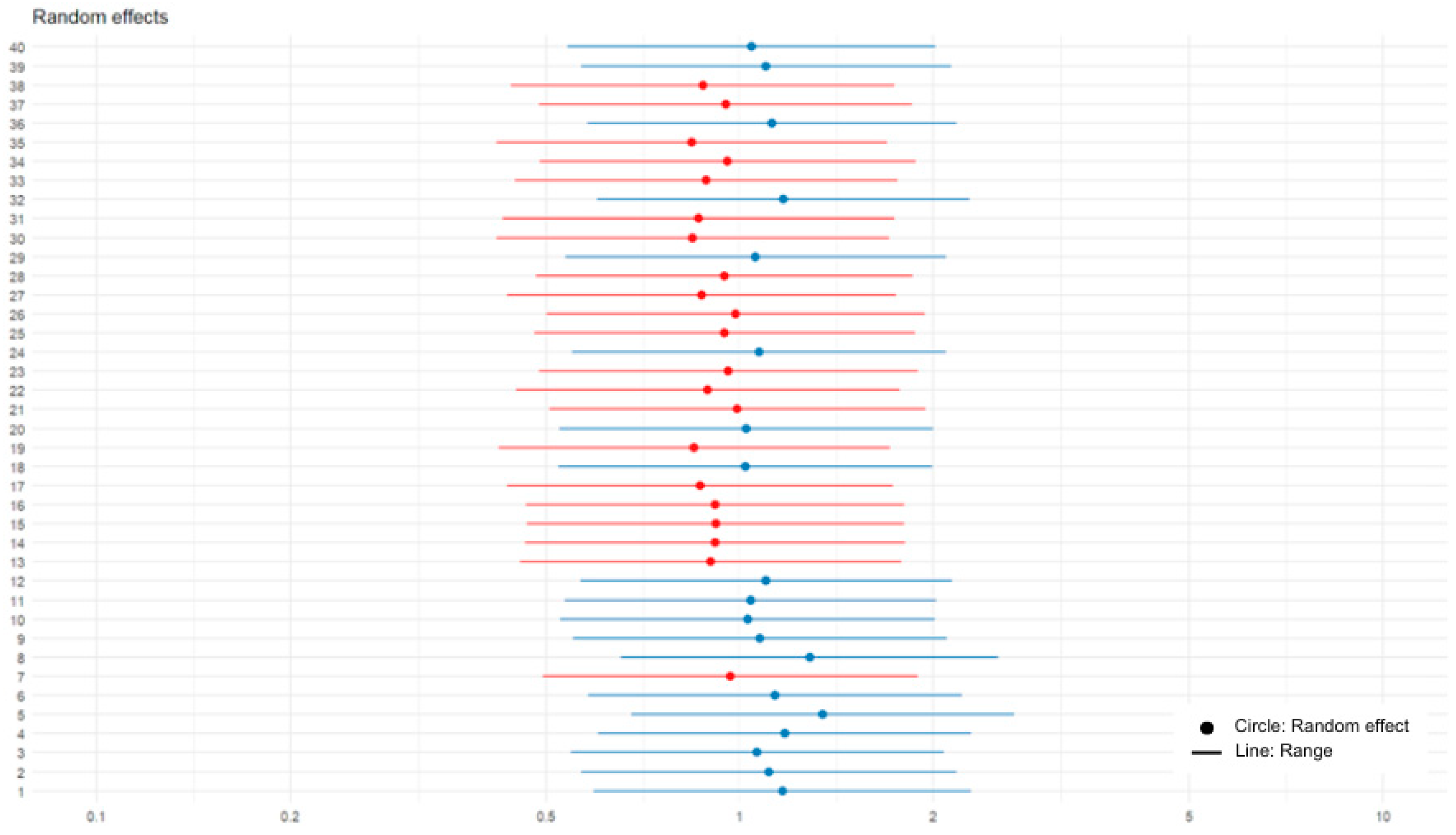 Random-effect analysis (Figure 3) revealed modest temporal variability, with most quarterly periods clustering near the reference value. This confirms that the random effect for time effectively captured minor unobserved fluctuations without compromising fixed-effect stability.