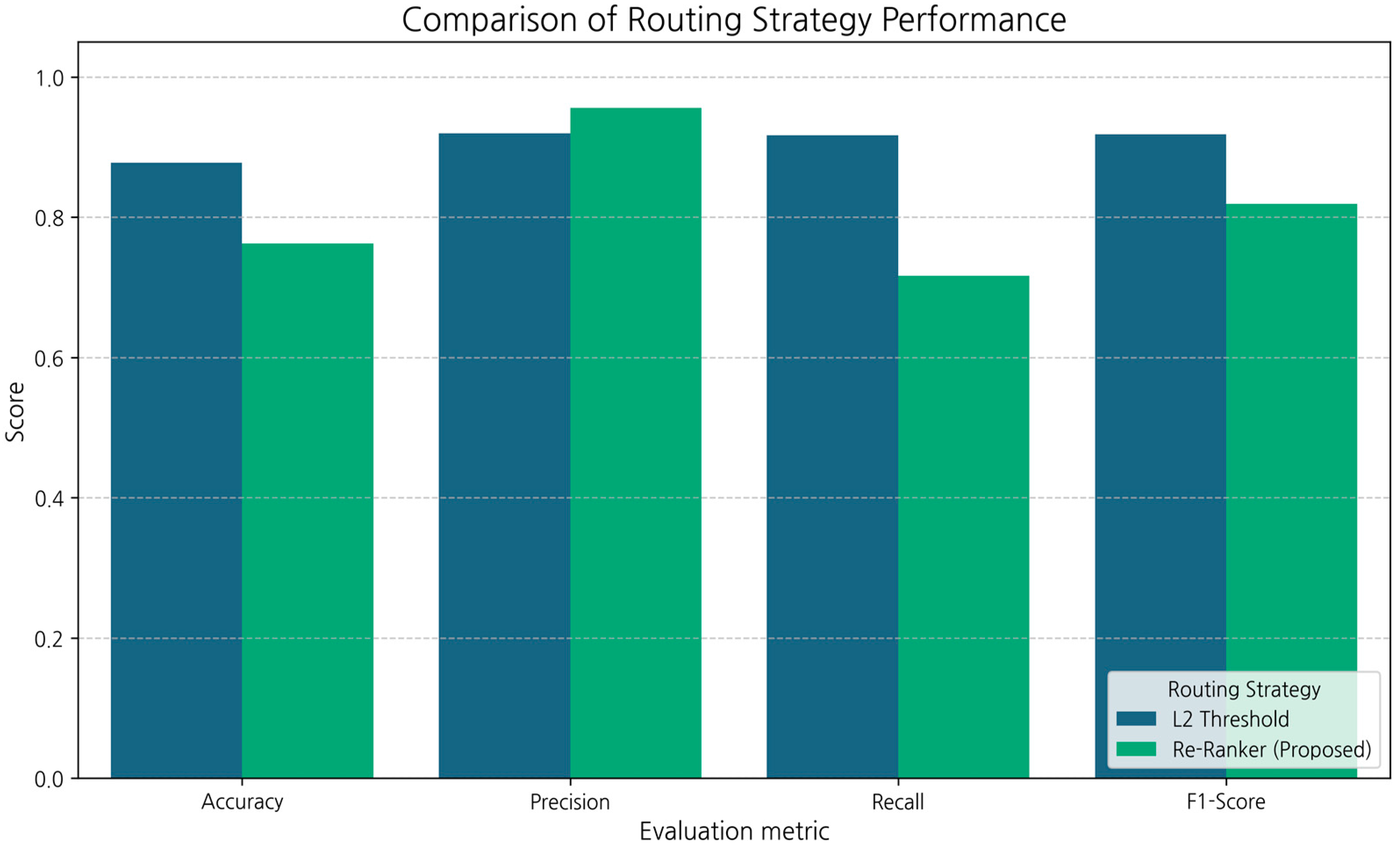 - Proposed: RAG + Reranker Threshold Routing represents the full pipeline described in Section 3.1.2, where the routing decision is based on the reranker score threshold (RERANK_THRESHOLD = 0.02) derived from score distribution analysis (Section 3.2.1). This configuration leverages cross-encoder-based semantic scoring to more precisely distinguish contextually relevant queries from irrelevant ones.