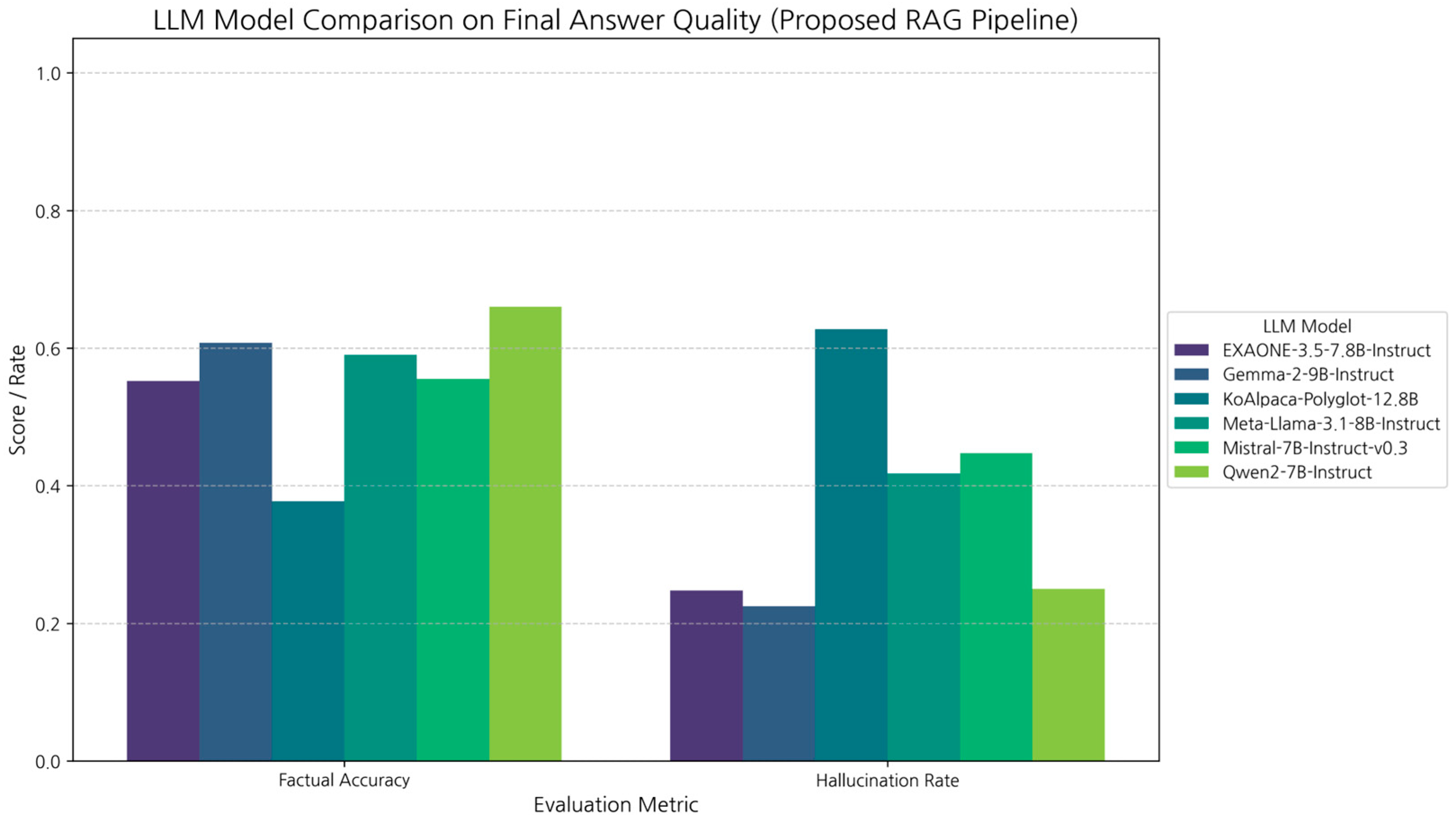 | (RQ3) | Generative LLM comparison | Within the optimized RAG pipeline, what differences in performance are observed among various open-source LLM architectures: Llama 3.1, Qwen2, Gemma-2, KoAlpaca, Mistral, and EXAONE? |