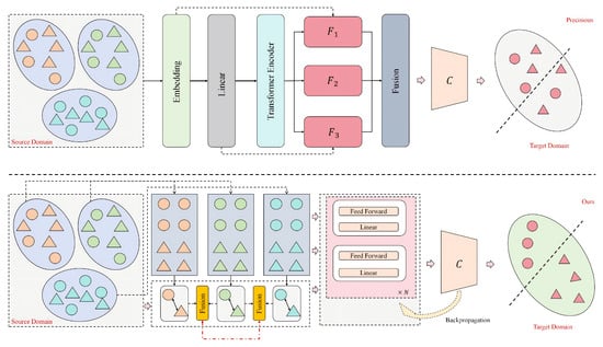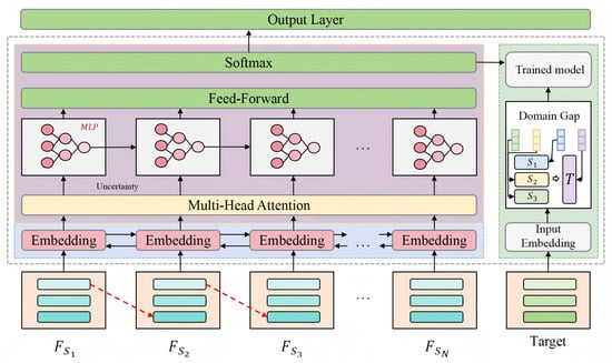 Assuming that the inputs are drawn from multiple source domains , and the target domain is denoted as , the embedding vector of each sample can be represented as