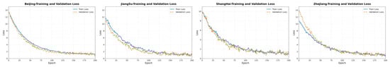 As shown in Figure 4, when different regions are used as target domains, both training loss and validation loss exhibit a stable downward trend, indicating that the model achieves good convergence and stability during cross-domain training. Overall, the loss curves for each region drop rapidly within the first 50 epochs and then gradually stabilize, with only a small gap between the validation and training losses. This suggests that the model does not show significant overfitting in any domain. These results demonstrate that the proposed structure-invariant encoding and uncertainty modeling mechanisms effectively suppress performance fluctuations caused by inter-domain distribution shifts, enabling the model to maintain a consistent optimization direction and robust risk identification capability throughout multi-source learning.