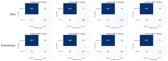 As shown in Figure 5, when different regions are used as target domains, the proposed method exhibits a higher concentration along the diagonal of the confusion matrix, indicating a more stable discriminative ability across various sample categories. Compared with the baseline Transformer model, the proposed approach achieves more accurate differentiation between positive and negative samples, with a significantly reduced number of misclassified instances. Notably, even in regions with large discrepancies in sample distributions (such as Jiangsu and Zhejiang), the model maintains a high level of recognition consistency, demonstrating strong cross-domain generalization capability. These results suggest that the proposed structure-invariant feature modeling and uncertainty-aware mechanisms effectively enhance the model’s robustness and discriminative power, providing a more reliable decision basis for enterprise risk identification tasks.