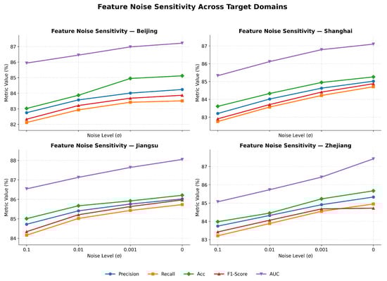 As shown in Figure 8, the feature noise sensitivity experiment illustrates the model’s performance under different regional target domains. It can be observed that as the noise level gradually decreases from 0.1 to 0, all evaluation metrics exhibit a consistent upward trend, indicating that the proposed method demonstrates strong robustness and stability against input feature perturbations. Among them, the increases in AUC and accuracy (Acc) are the most prominent, suggesting that the model maintains a high level of risk discrimination capability even under feature space disturbances. Meanwhile, the balance between precision and recall is effectively preserved without significant shifts or fluctuations, reflecting that the proposed structure-invariant feature modeling and uncertainty-aware mechanisms can effectively suppress feature drift induced by noise interference.