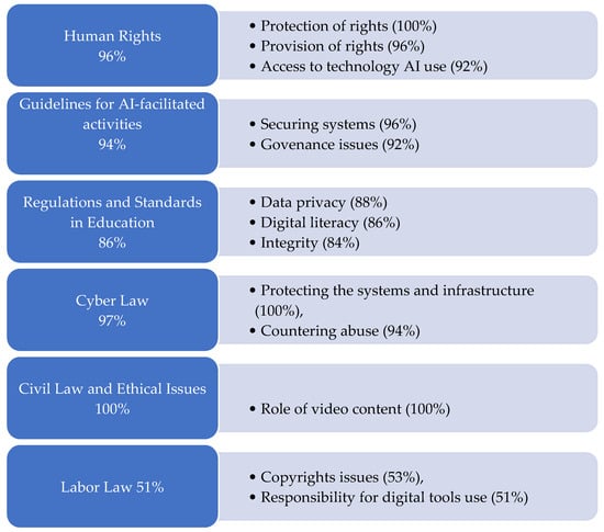 The investigation of sources has resulted in the structure of interrelated clusters, introducing key legal concepts and areas of current legislation that refer to the institutional governance of AI-facilitated representatives of human lecturers in educational videos. The structure is introduced in Figure 1. The percentages reflect the frequency of cluster themes and key concepts in the analyzed sources, although these values may vary when additional sources are examined in future studies.
