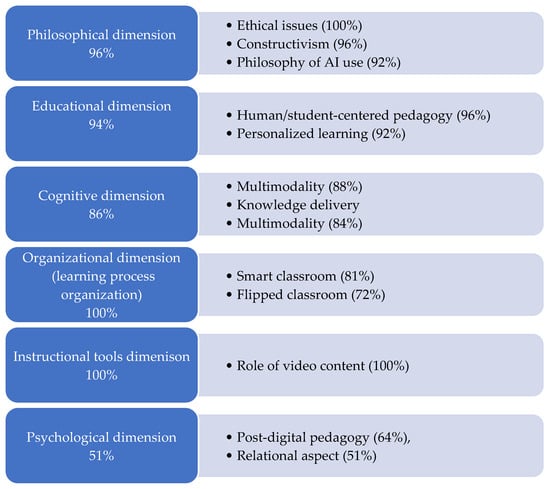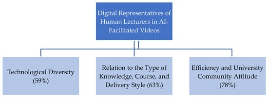 The identified clusters characterize theoretical dimensions and their concepts that academic studies currently employ when considering the issue of AI-facilitated representatives of human lecturers in educational videos. The percentages indicate the frequency of cluster themes and key concepts in the analyzed sources, although values may vary as additional sources are examined in future studies.