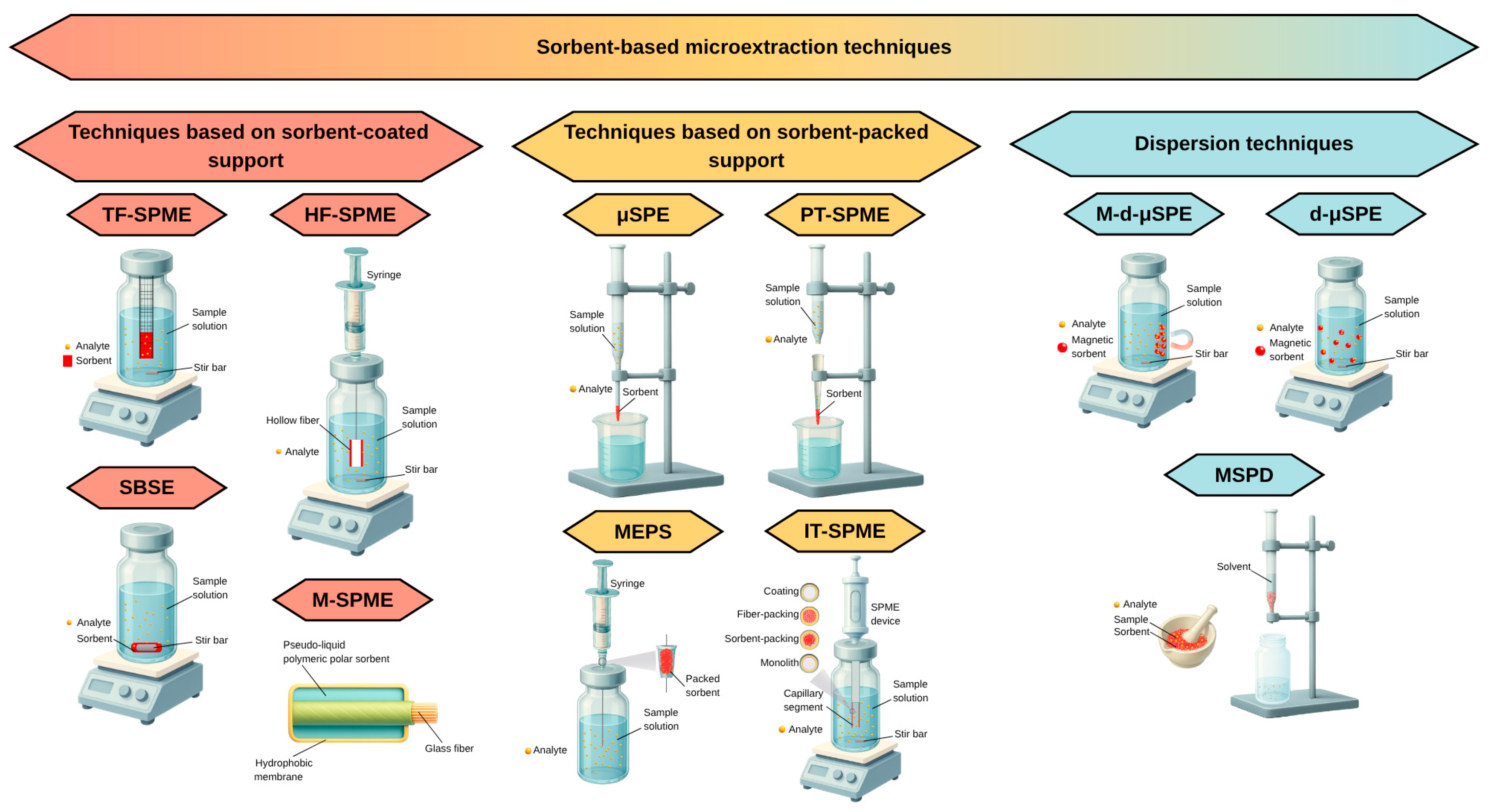 - techniques based on a sorbent-packaged support: micro solid-phase extraction (μSPE), pipette tip solid-phase microextraction (PT-SPME), in tube solid-phase microextraction (IT-SPME), microextraction by packed sorbent (MEPS),