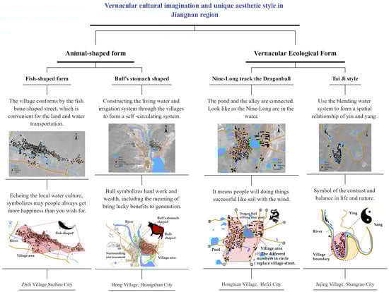 Jiangnan, located in the middle and lower reaches of the Yangtze River, China, is a rapidly developing urban–rural area marked by geographic variability and cultural integration. Historically, population migration, north–south cultural integration, and the distinctive climate of villages have contributed to the spatial variety of traditional villages in the Jiangnan region [5]. It provides a typical case for investigating village morphology in a multicultural context, with all built before the Ming and Qing dynasties. Additionally, Jiangnan traditional villages present the spatial characteristics of a tangible environment, incorporating the wisdom of vernacular culture [6]. The local development of feng shui culture in traditional practical construction not only satisfied spatial layout principles but also effected a vernacular cultural imagination and distinctive spatial style (Figure 1). It is, we argue, essential to systematically explore the relationship between the spatial forms of culture and their digital quantitative characteristics, aiming to uncover the sustainable development potential of village space in cultural heritage preservation.