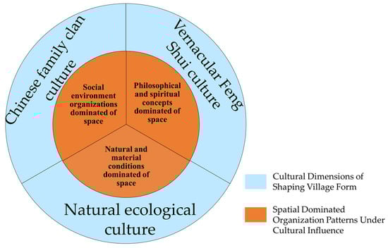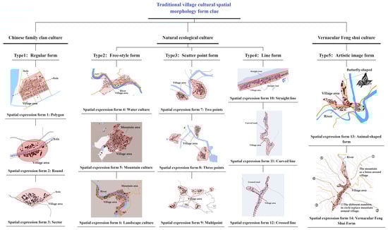 Architect and scholar Aldo Rossi developed a third typology by classifying architectural space types [39]. He argued that architecture and space should not be considered in isolation but should be comprehensively integrated into urban organization, historical civilization, and cultural context. Therefore, in this study, the essence of spatial morphology classification is not merely categorization but an exploration of the cultural logic underlying each form. For Chinese traditional villages, spatial morphology, with the Jiangnan region being a typical example, is shaped by collective spatial planning during agricultural civilization of villages [40]. The spatial morphology of traditional Chinese villages reflects certain cultural influences and is driven by three dimensions: Chinese family clan culture, natural ecological culture, and vernacular feng shui culture [41,42,43] (Figure 5). Under the influence of Chinese family clan culture, spatial organization is dominated by social environment organizations, forming regular layouts with hierarchical order through axial alignment. Under the influence of ecological culture, spatial organization is dominated by natural and material conditions, giving flexible and organic forms. Under the influence of feng shui culture, spatial organization is dominated by philosophical and spiritual concepts, integrating spiritual symbols and cultural motifs to generate pictographic spatial forms. Therefore, we established a cultural spatial morphology form clue (CSMFC) from three cultural dimensions, constructing an index system and database for five morphological types, and summarized the spatial expression form and morphological indices (see Figure 6, Table 2).