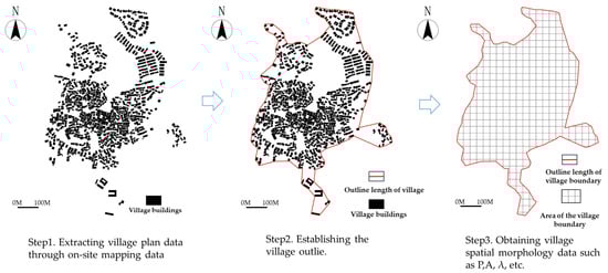 In this research, we establish a CSMFC and utilize the SRM to analyze the dynamic relationship between village cultural spatial morphology and digital quantification, which consists of four steps (Figure 4). First, we collect spatial information for 500 villages and build a database. Subsequently, we use ArcGIS10.2 to model 500 village spatial forms and construct a CSMFC based on morphology research. Third, we digitalize the morphological indices of village spatial forms. Finally, we summarize digital principles of cultural space morphology via SRM from a metamodern perspective. This process comprehensively considers the dynamic relationship between culture and spatial forms.