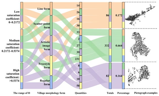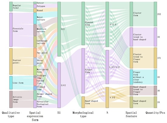 - In scatter-point form villages, there are no band-shaped form villages at the digital level, which would appear to be the obvious type of spatial morphology, with the largest value of S. This indicates that village spatial morphology is most complex for this village type. ϴ is the second largest, indicating a stronger external expansion trend, while S2 is the largest, indicating low public space fragmentation. This point-dispersed spatial pattern is shaped by cultural bonds and a holistic sense of identity with the natural environment, embodying a resilience that anchors cultural roots within dispersed spaces and generates dynamic spatial forms from fragmentation.