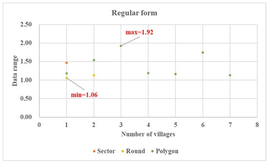 - Regular form villages all take the cluster form at the digital level. The S is the most stable, ϴ is smaller, and the S2 is the smallest. These data indicate that this village type exhibits the simplest, most stable spatial morphology, reflecting its inherent cohesion. This stable and cohesive anchoring pattern embodies that Chinese family culture’s moderate and orderly ritual logic has shaped village form.