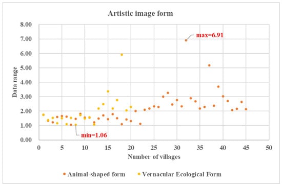 - In artistic image form villages, the proportion of finger form villages is the largest, and the S is as high as 6.9, indicating high spatial morphology complexity. The range of changeable ϴ is larger, and S2 is the second largest. Under the influence of feng shui culture, the village space anchors local complexity and unique variability, fostering cultural dynamism within fragmented spatial arrangements.