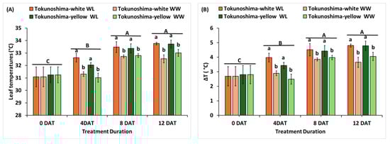 The effects of waterlogging on leaf temperature and ΔT are presented in Figure 2A,B. The waterlogging treatment and waterlogging duration significantly affected leaf temperature and ΔT (p < 0.001); the interaction of treatment and waterlogging duration also significantly affected leaf temperature and ΔT (p < 0.01) (Table 1). Meanwhile, no significant difference was observed between the two cassava cultivars (Table 1). The leaf temperature of the two cassava cultivars increased immediately under waterlogging treatment at 4, 8, and 12 DAT compared to the WW condition (Figure 2A). The same trend was observed for ΔT in the two cassava cultivars (Figure 2B). The average leaf temperature increased by 27.2%, 14.7%, and 24.0% in the Tokunoshima-white cultivar and by 27.5%, 10.2%, and 15.3% in the Tokunoshima-yellow cultivar under WL conditions at 4, 8, and 12 DAT, respectively (Figure 2A). The average ΔT value increased by 3.2%, 1.7%, and 2.1% in the Tokunoshima-yellow cultivar and by 4.0%, 2.2%, and 3.6% in the Tokunoshima-white cultivar at 4, 8, and 12 DAT compared to WW conditions (Figure 2B). Additionally, the effects of leaf temperature and ΔT on cassava cultivars increased under WL conditions with the duration of treatment (Figure 2A,B).
