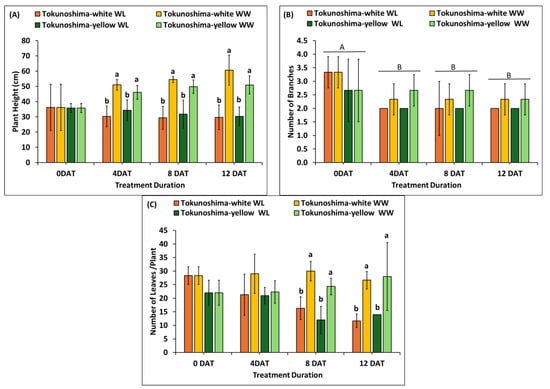Finally, the number of leaves per plant of both cultivars was significantly (p < 0.001) affected by WL treatment at 8 and 12 DAT but was not significant at 4 DAT. However, the effect of treatment duration on the number of leaves per plant was not statistically significant (Table 1). The effect of the interaction of treatment duration and condition had a significant effect (p < 0.01), and cultivars were significantly different (p < 0.05) (Table 1). The number of leaves per plant of WL Tokunoshima-white and Tokunoshima-yellow cultivars decreased by 26.4% and 6%, respectively, compared to those of WW cultivars. The Tokunoshima-white cultivar exhibited the largest reduction in the number of leaves per plant with 56.3% at 12 DAT compared with 50% for the Tokunoshima-yellow cultivar (Figure 5C).