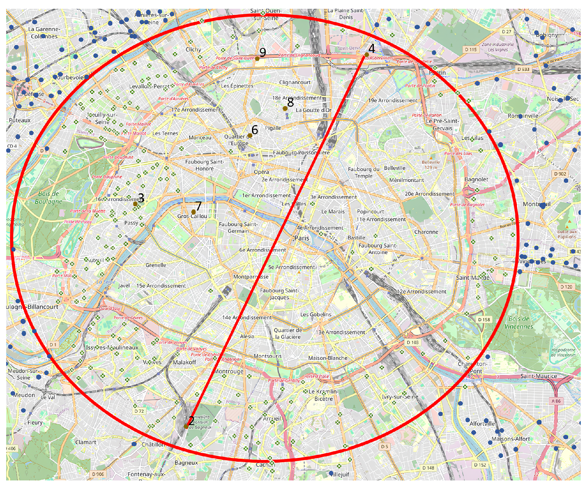 Third, the physical energy model contributes directly to several of these deviations. Unlike linear distance-based models used in much of the EVRP literature, the model employed here incorporates aerodynamic drag, rolling resistance, vehicle mass, slope, and speed variability. This increases the sensitivity of EV feasibility to micro-topographic features of the Parisian road network. In practice, this means that EV consumption spikes on uphill or high-speed segments can trigger earlier-than-expected charging events, causing additional detours. This behavior helps explain the higher-than-anticipated distance inflation in instances 1, 2, and 5 (+108% to +112%), and aligns with recent studies advocating physics-informed models for EV routing by Bruglieri et al. [