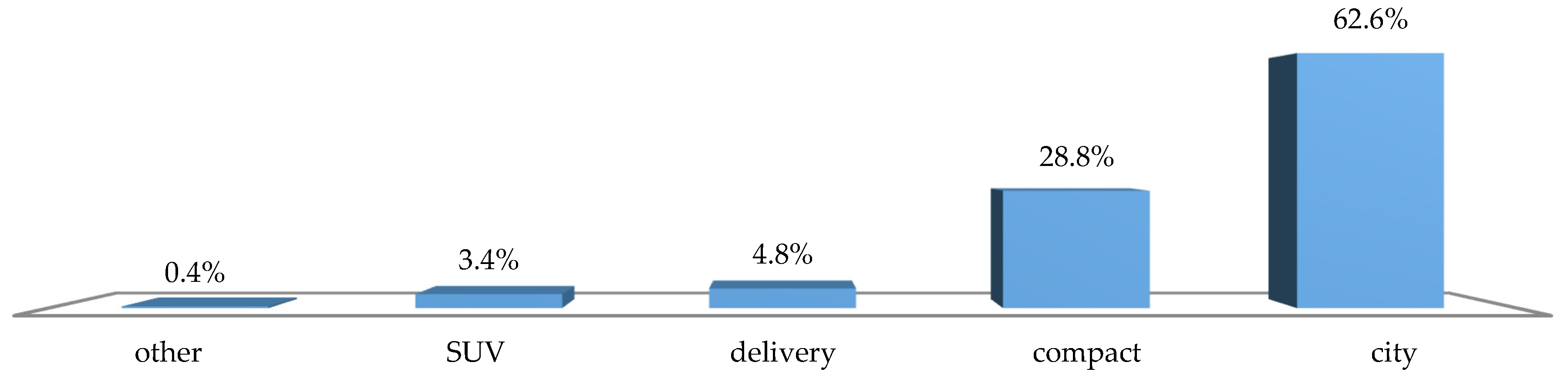 - Turoń, K. Selection of Car Models with a Classic and Alternative Drive to the Car-Sharing Services from the System’s Rare Users Perspective. Energies 2022, 15, 6876. [Google Scholar] [CrossRef]