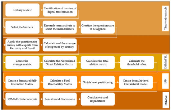 The panel of experts consisted of two phases: (i) a ranking scale of influence to select the main barriers, and (ii) a ranking of the barriers selected by experts in Brazil and Germany. Four digital transformation experts (Table 1)—each with published research on the topic—examined, refined, and confirmed the list of barriers and their underlying categories.