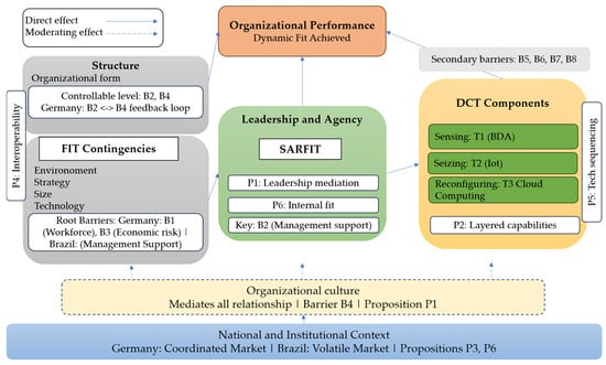 Recent comparative digitalisation research underscores that leadership cognition serves as a central mechanism that translates environmental uncertainty into capability-building decisions [67,71]. National institutional arrangements and cultural logics shape leadership agency and digital transformation trajectories [32,72,73,74]. These empirical insights support the proposition that top management support in Brazil and structured decision-making in Germany represent context-specific expressions of the same underlying cognitive alignment process linking structural contingency and dynamic capability activation. The theoretical foundations underlying these mediating mechanisms are elaborated in the following section.