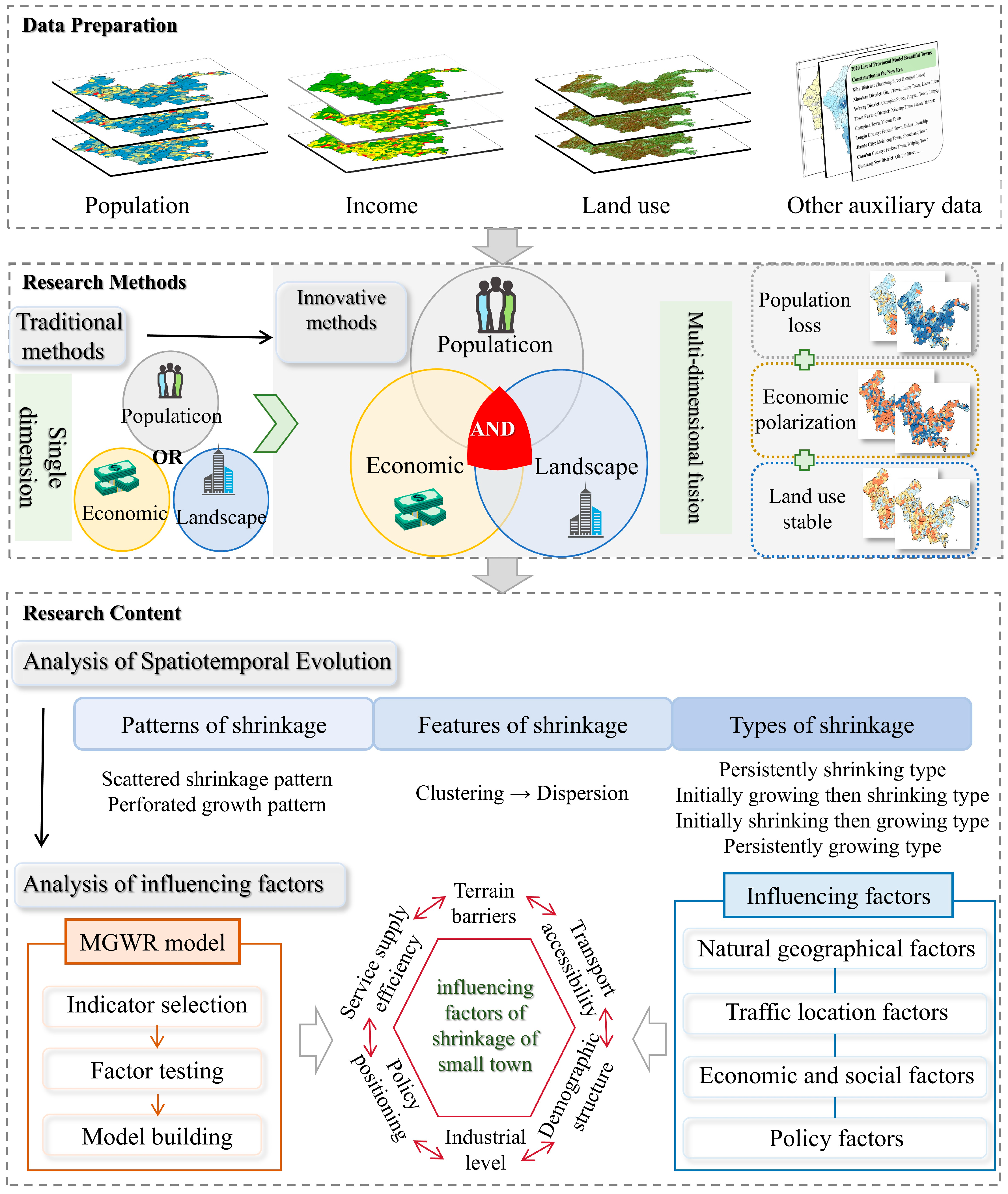 - Han, Y.; Deng, Y.; Ni, R. Why small towns are shrinking: The spatial heterogeneity of small town shrinkage and its impact from the perspective of rural–urban interaction in China. PLoS ONE 2023, 18, e0293889. [Google Scholar] [CrossRef] [PubMed]
