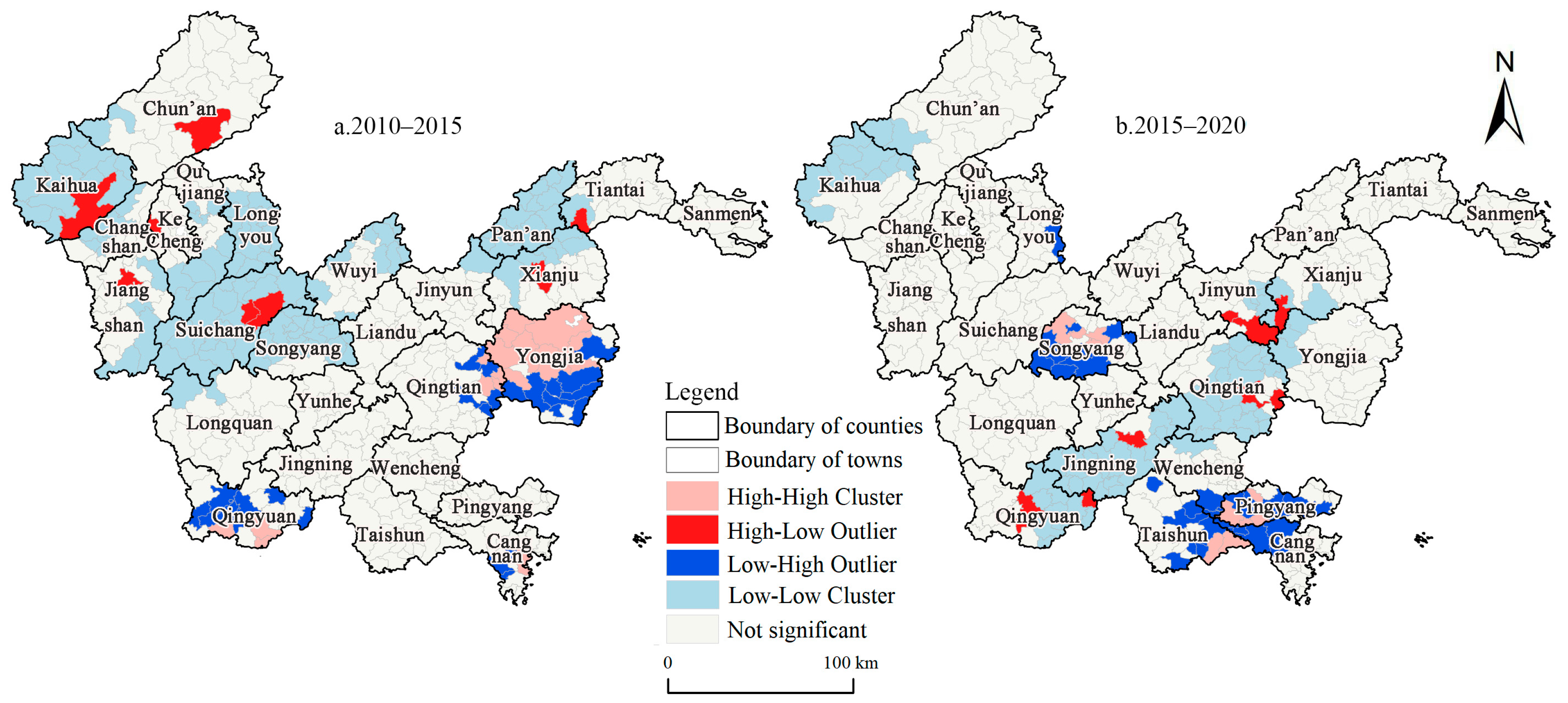 - During the study period, the spatial pattern of small-town shrinkage in the 26 mountainous counties of Zhejiang Province changed from a scattered distribution to a strip-shaped and block-shaped distribution. A “V”-shaped shrinkage aggregation belt formed along the axis of “Kaihua–Jingning–Yongjia,” extending to the northeast and northwest directions. Moreover, the shrinkage trend exhibited a significant positive spatial autocorrelation.