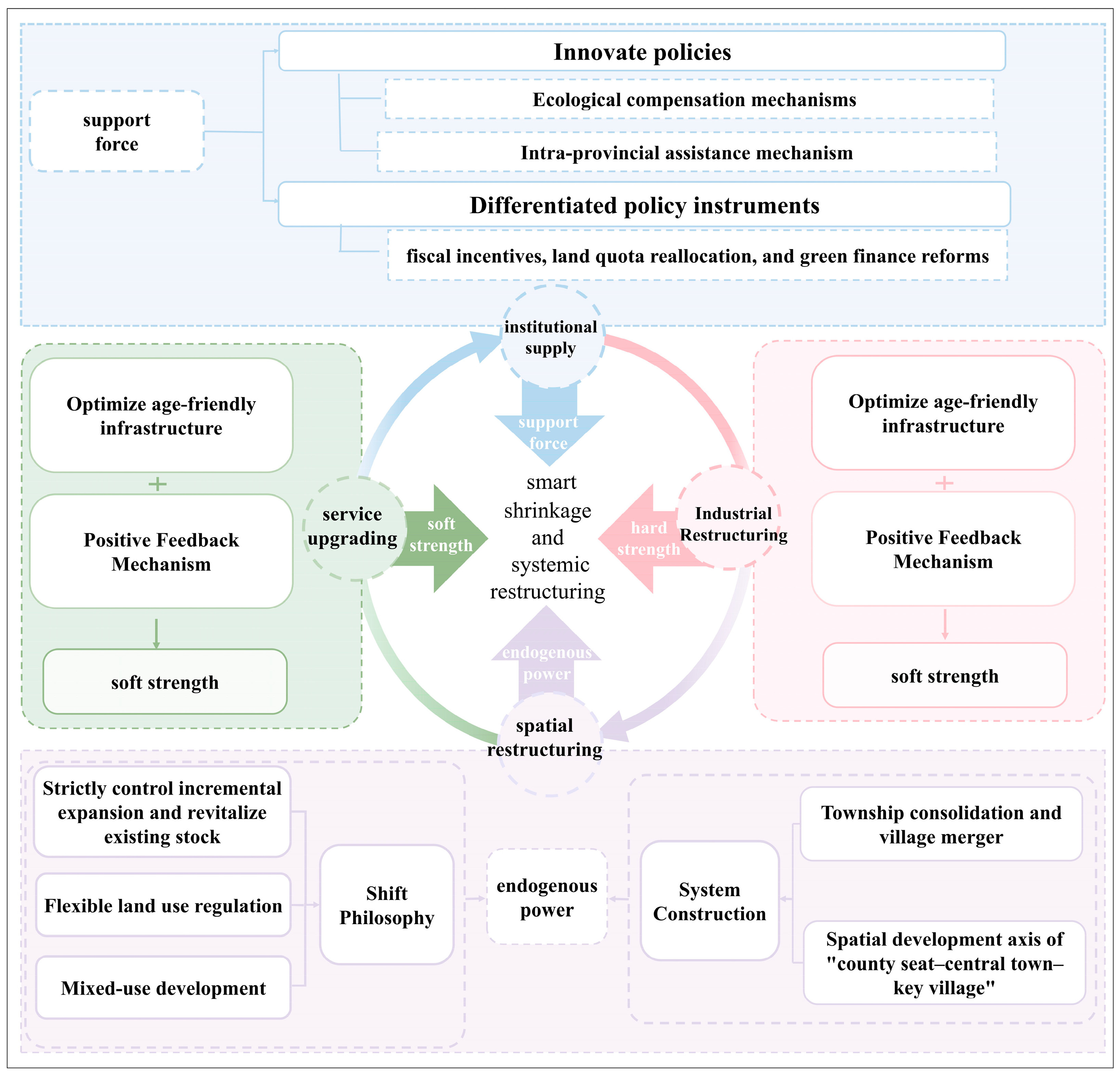 - Innovating a policy supply and coordination strategy compatible with incentives constitutes the institutional guarantee [24,32,66,67]. Innovate the policy system for the protection and development of mountainous areas, strengthen vertical fiscal transfers at the provincial level and horizontal coordinated development among counties and districts, and guide the targeted flow of talents and resources through differentiated policy instruments such as fiscal incentives, land quota reallocation, and green finance reforms. These measures provide institutional momentum for smart shrinkage and build institutional “supporting capacity” to slow down the shrinkage of small towns.
