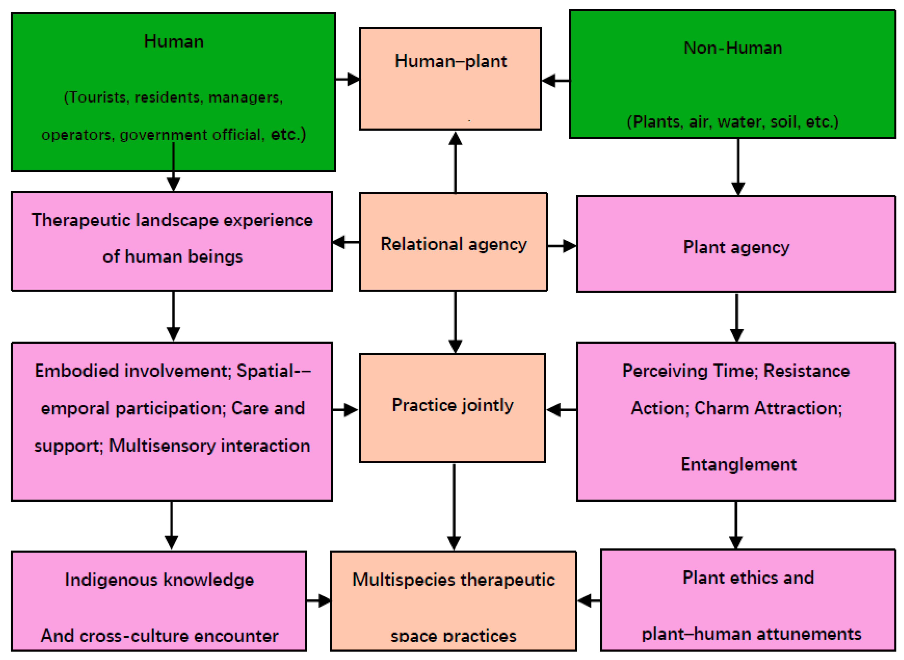 - Therapeutic Landscape Experience is the emergent outcome of these agentic encounters. It is not a static property of a landscape or a unilateral human perception, but a process co-produced through the material–semiotic interactions between humans and plants within a specific space.