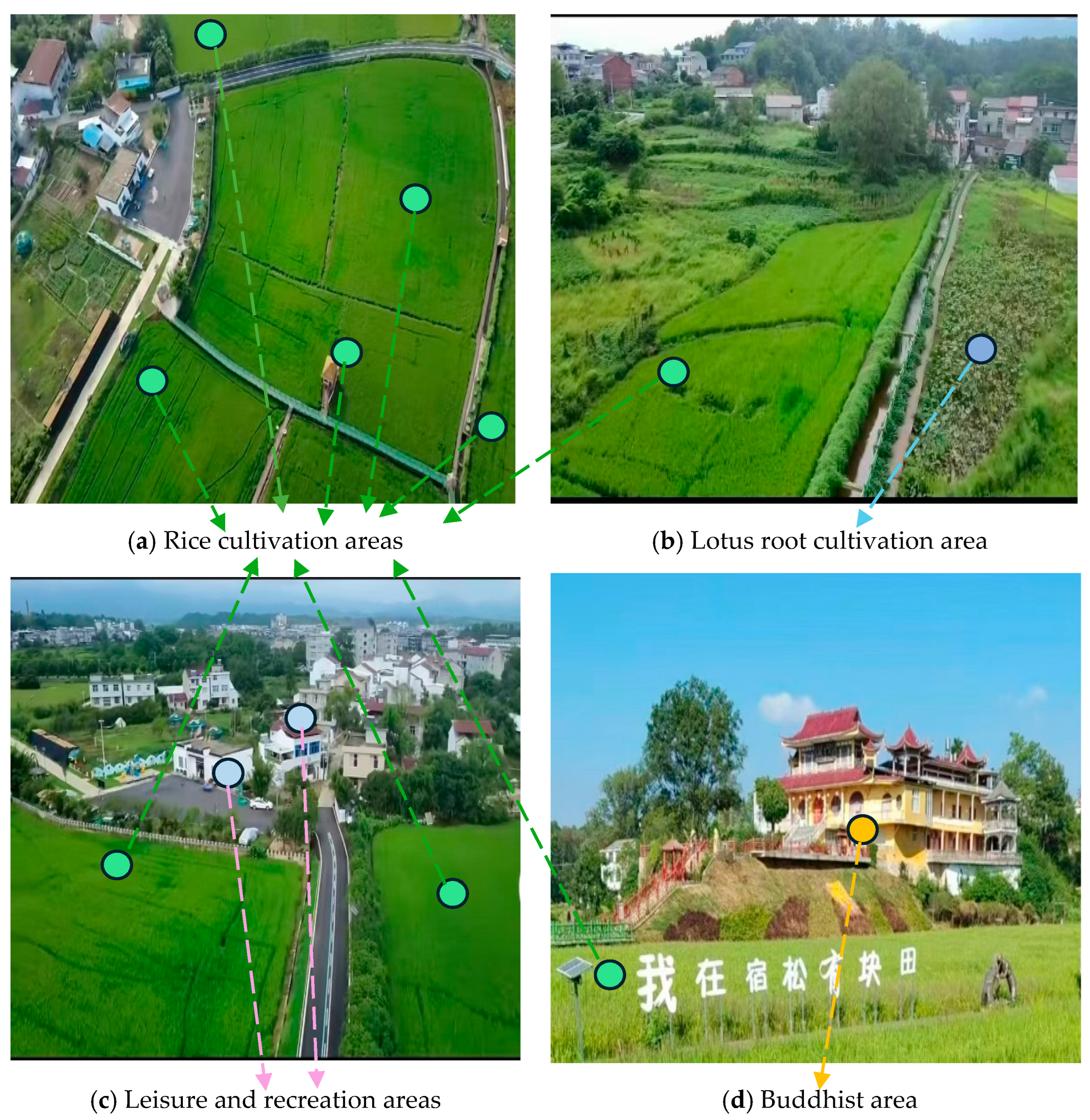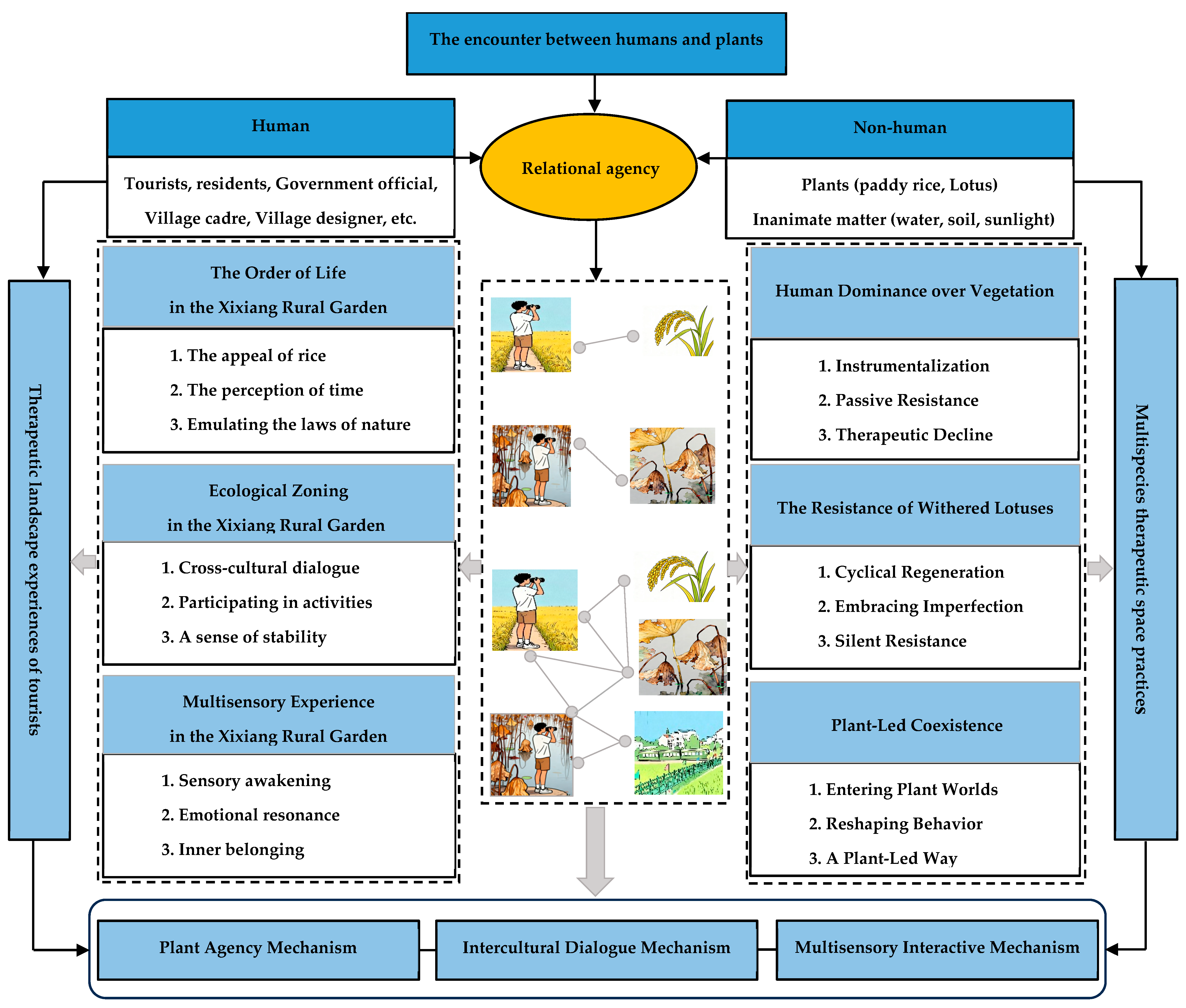 - Plant agency serves as a key mediator in enhancing therapeutic experiences. Through their visual and material qualities, rice plants and withered lotus stems draw visitors into the “plant world,” while their life cycles and ecological adaptability inspire respect and self-reflection. The Xixiang Rural Garden’s ecological zoning creates spaces for cross-cultural dialogue, where visitors perceive resilience and harmony through personified plant interactions. Local knowledge further encounters agricultural landscapes that awaken reverence for natural order. This integrated approach fosters human–plant coexistence, stabilizes interactions, and sustains therapeutic experiences while mitigating tourism’s ecological impacts.