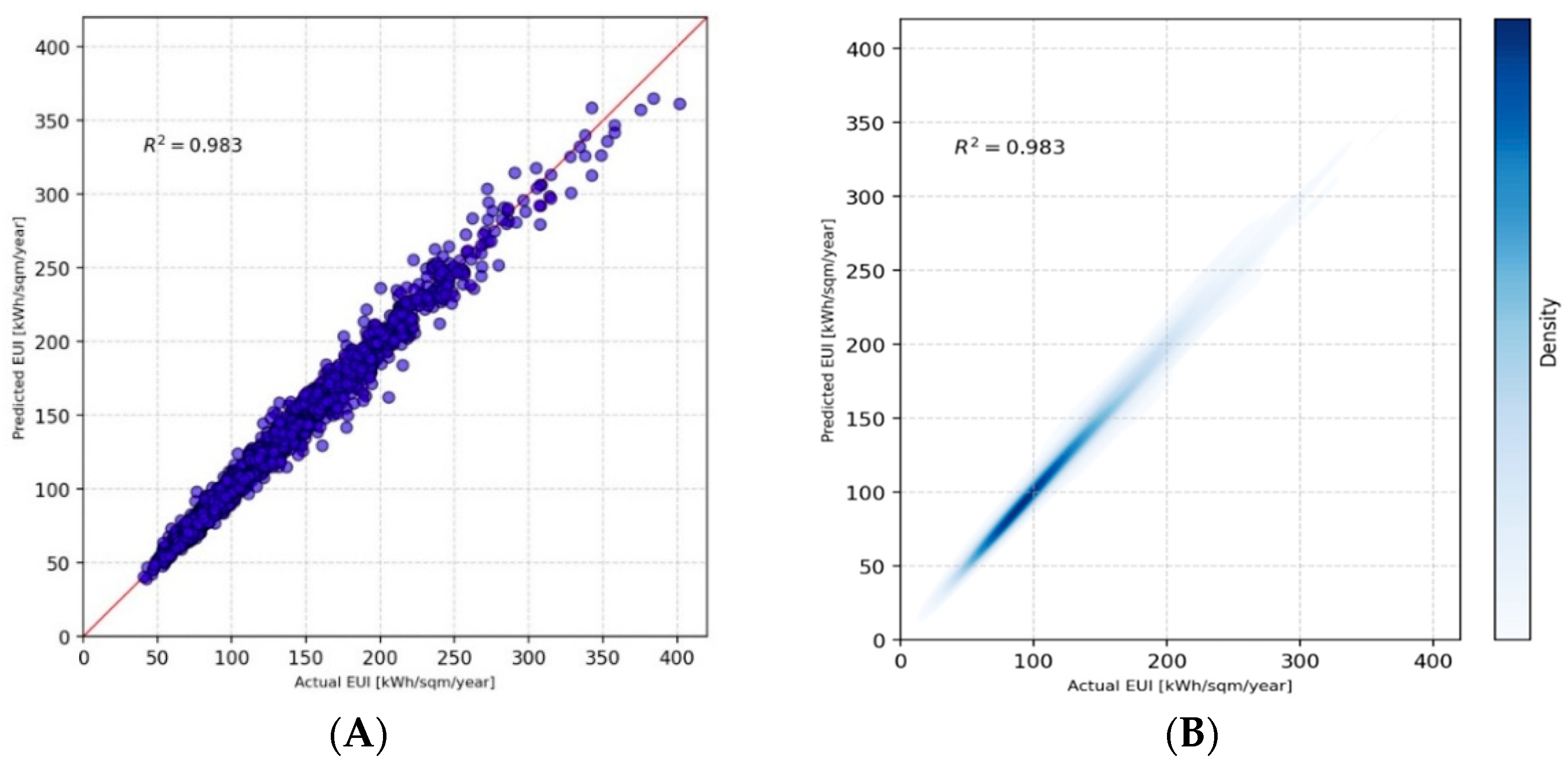 2 obtained more than 0.98) shows the predicted EUI values closely tracking the actual values, which confirms the model’s high accuracy.