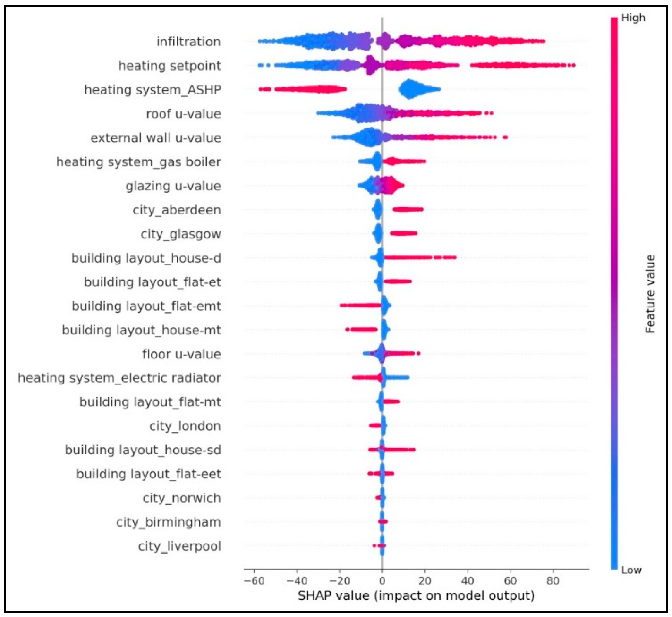 Figure 6 to illustrate the overall influence of each input feature on the model output by aggregating their contributions across the entire dataset. In this figure, features are ordered by their mean absolute SHAP values which enable the identification of the most influential predictors of EUI. The plot shows that infiltration rate, heating setpoint, and heating system type (particularly ASHP and gas boiler) impose the largest impact on the predicted EUI. Higher infiltration rates and higher setpoints consistently shift the predictions upward, whereas the presence of ASHP systems is strongly associated with reductions in EUI. Envelope-related features such as roof, external wall, glazing, and floor U-values also demonstrate significant contributions, with higher U-values generally pushing EUI upward due to increased heat losses. Location and building layout variables showed smaller yet non-negligible effects, which reflects regional climatic variations and differences in exposed surface area. Overall, the summary plot provides a global interpretability view which completes the case-specific waterfall plots by revealing how each feature drives the model’s predictions across the entire dataset.