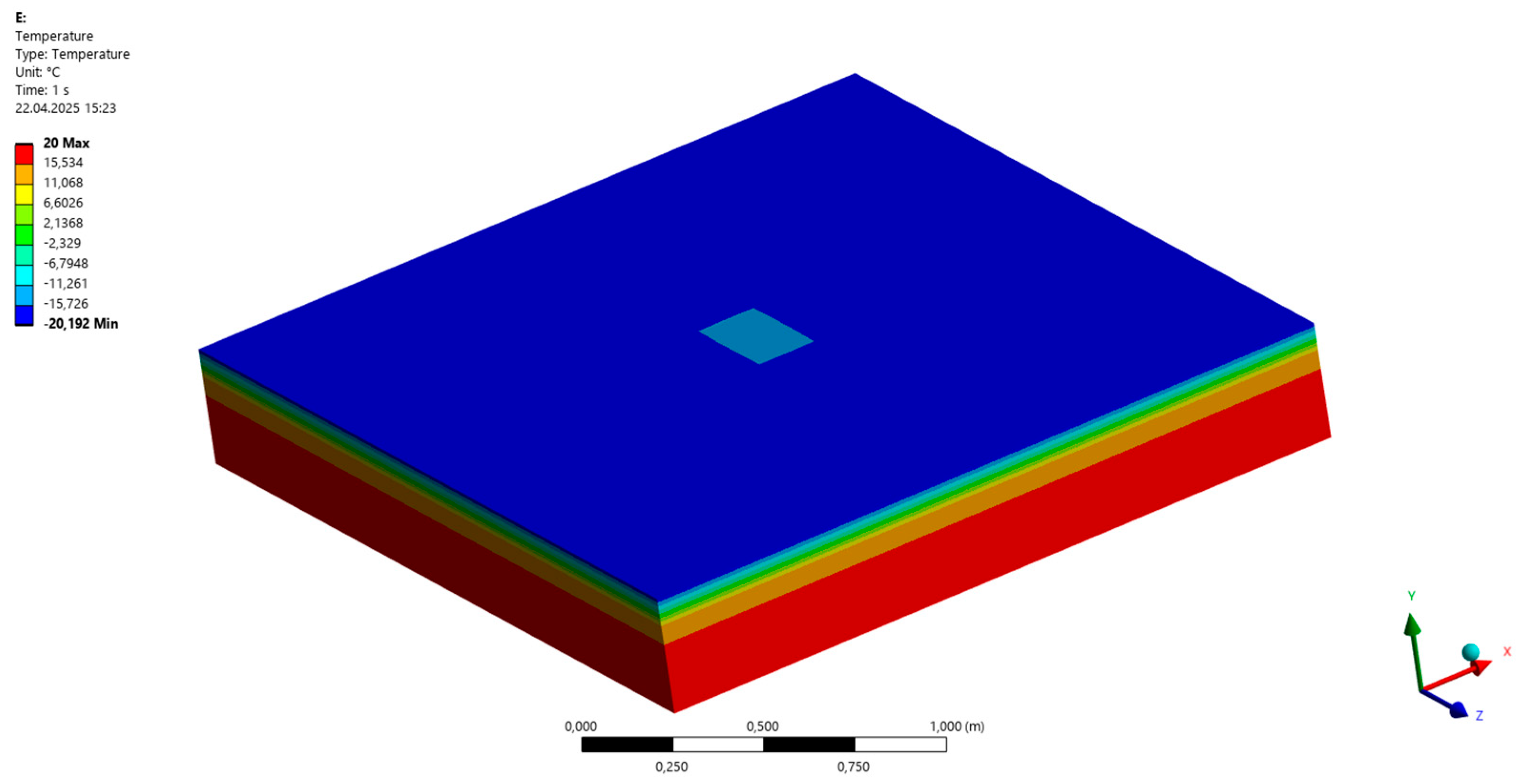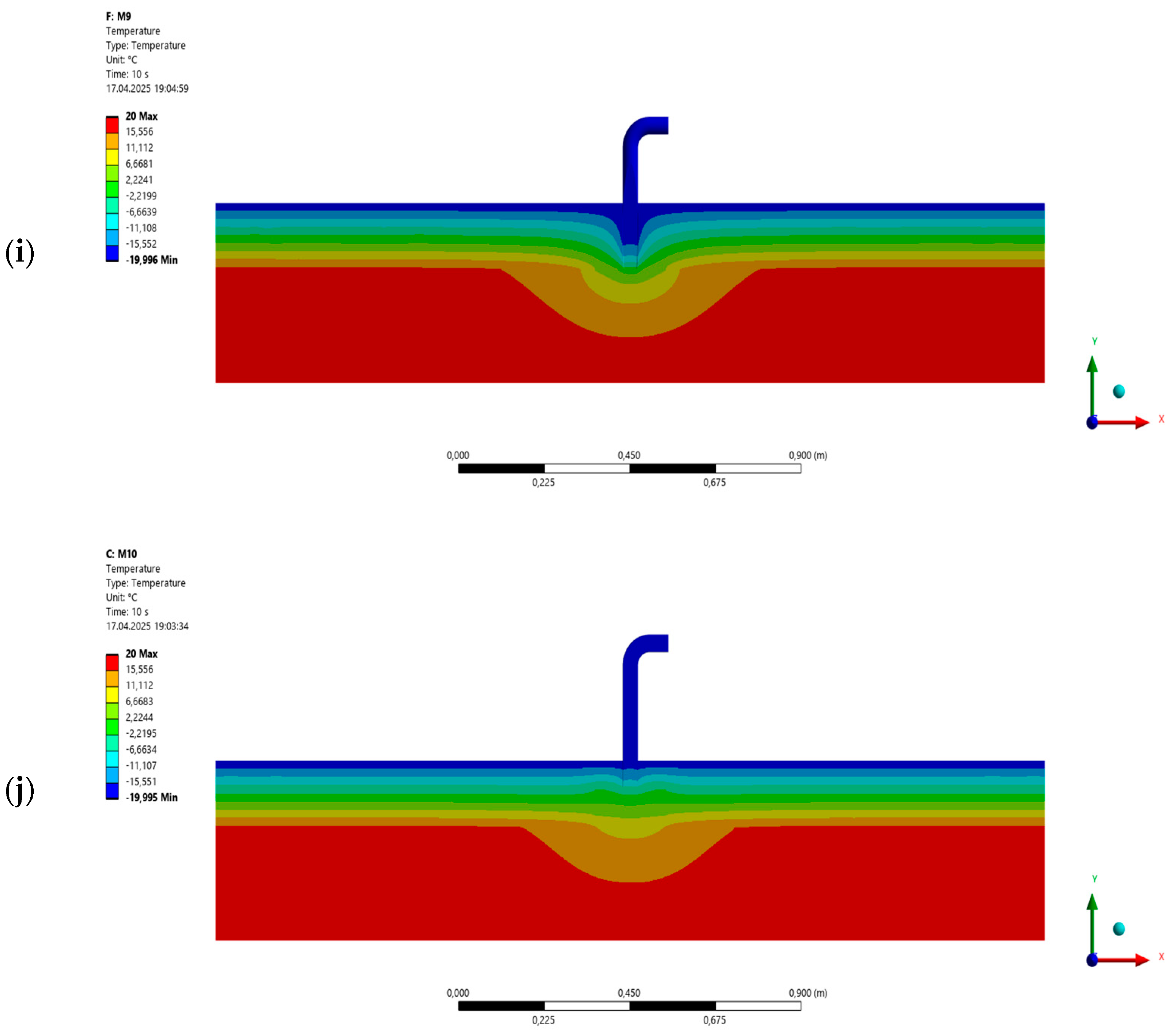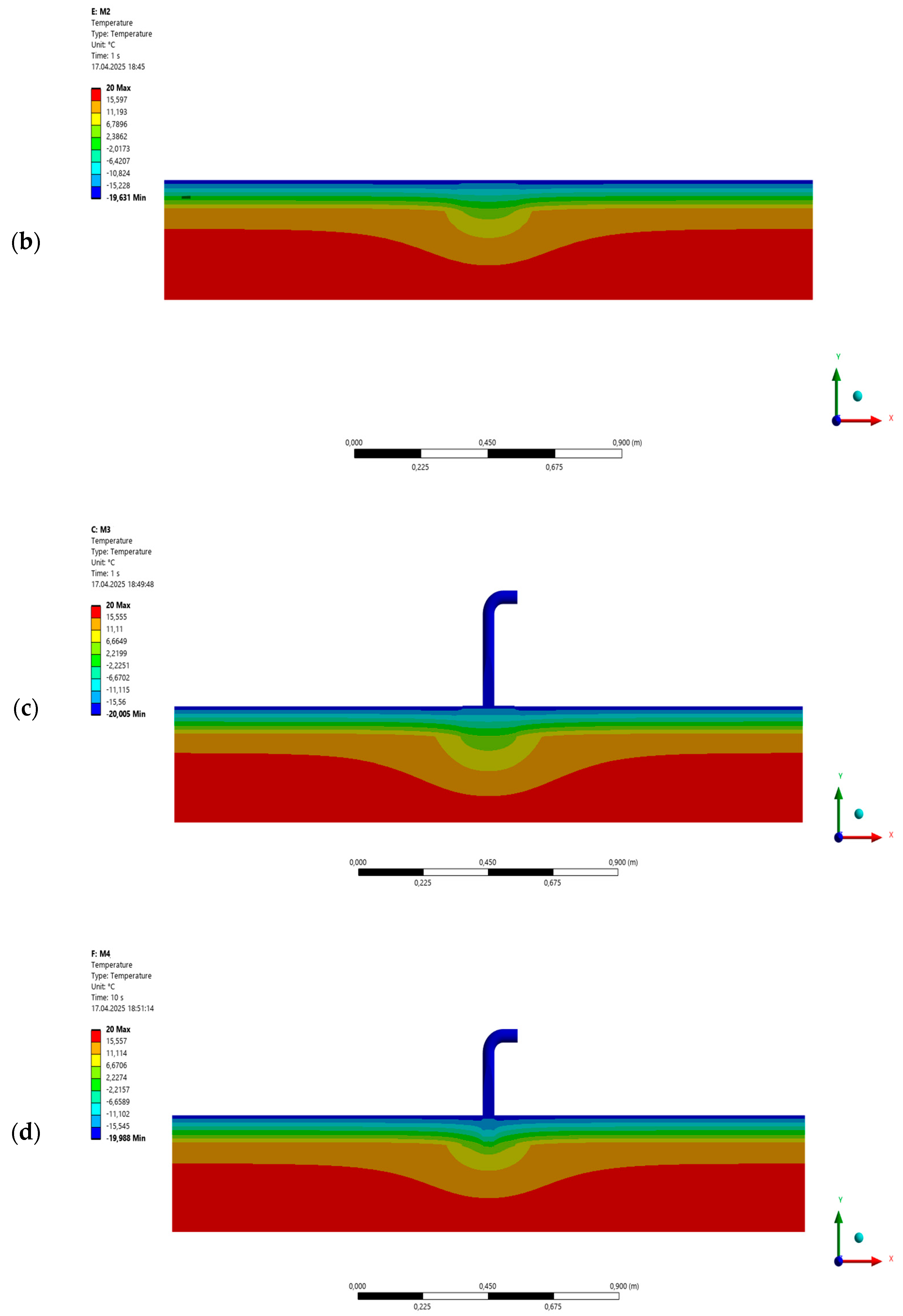 - A significant advantage of the mounting elements was observed in more realistic operating conditions (model M10). In this case, the use of the mounting block retained twice as much heat inside the room compared to the configuration without the block (M9). The temperature on the outer wall of the concrete block in the M10 model was 9.49 °C, while in the model without the mounting element (M9) the temperature in the same place reached −0.74 °C. Thus, the applied mounting block effectively reduced the impact of point thermal bridges at the antenna holder by approximately 50%.