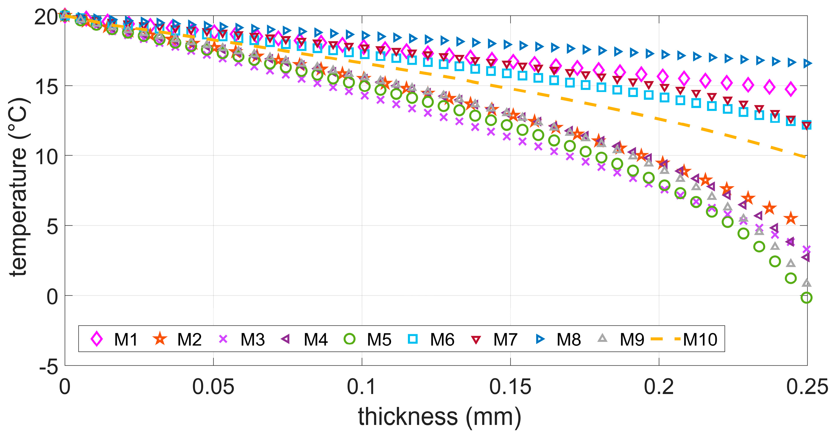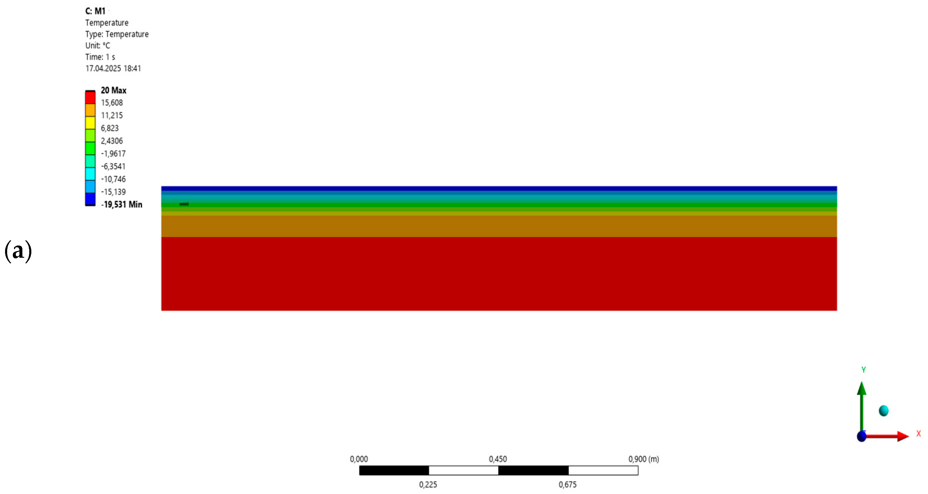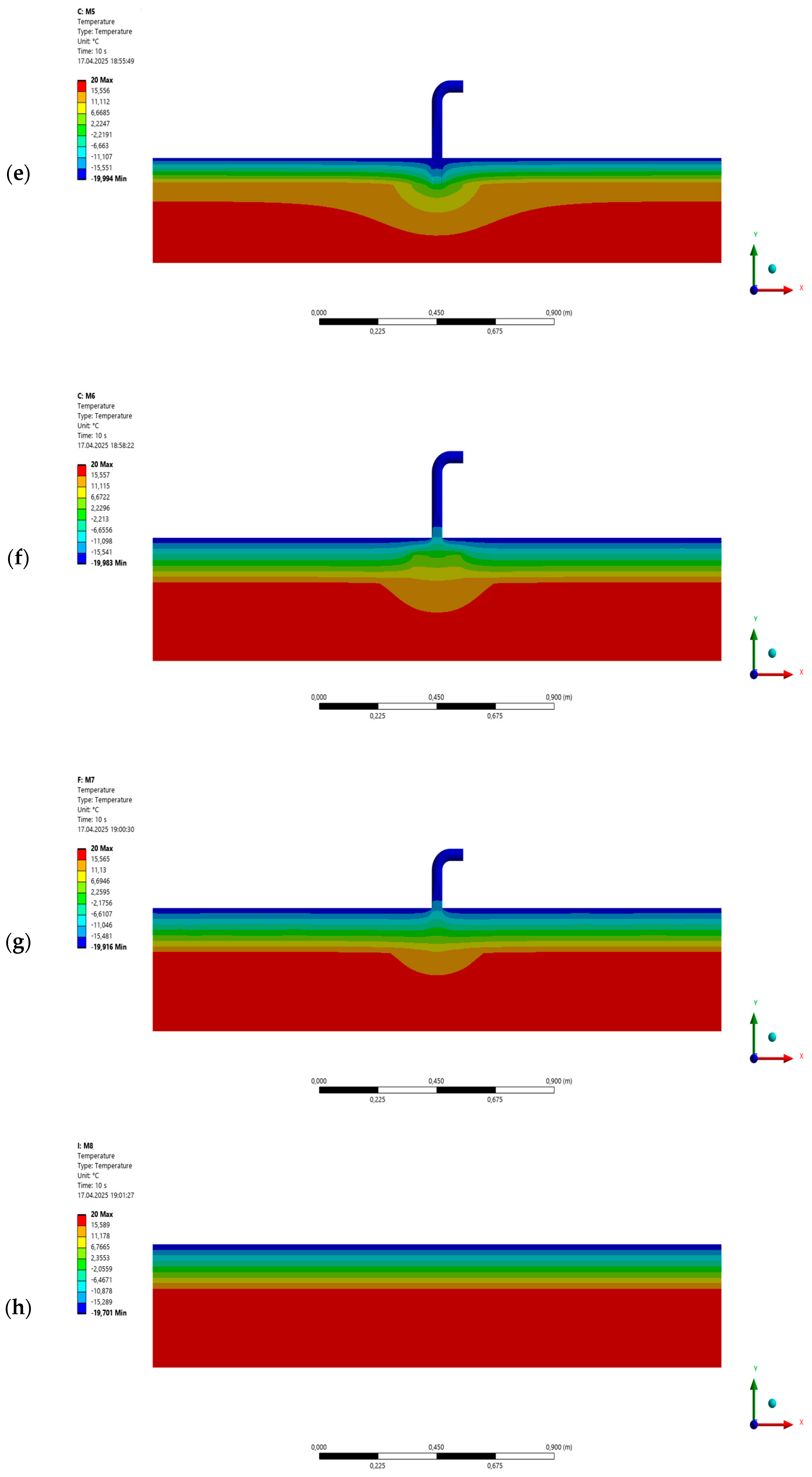 - Under ideal conditions (M4 and M3), it was found that the temperature distribution in the load-bearing wall was nearly identical. A similar situation was observed with two layers of polystyrene, i.e., model M6 and M7. The temperature difference did not exceed 2%.