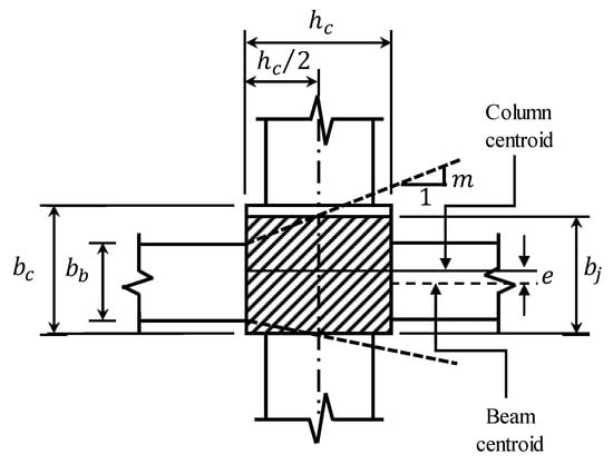 where bb and bc are the widths of the beam and column sections, respectively. For joints where the eccentricity between the beam centerline and the column centroid exceeds bc/8, m = 0.3 should be used; for all other cases, m = 0.5. The summation term should be applied on each side of the joint where the edge of the column extends beyond the edge of the beam. The value of mhc/2 should not be taken larger than the extension of the column beyond the edge of the beam.