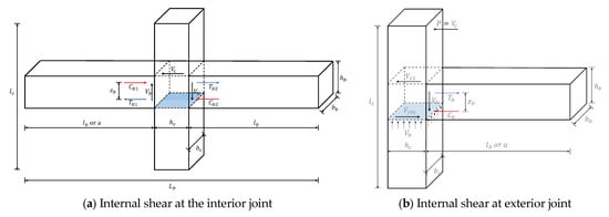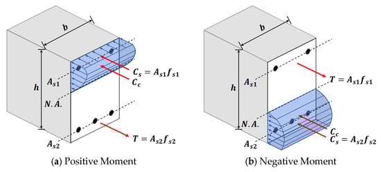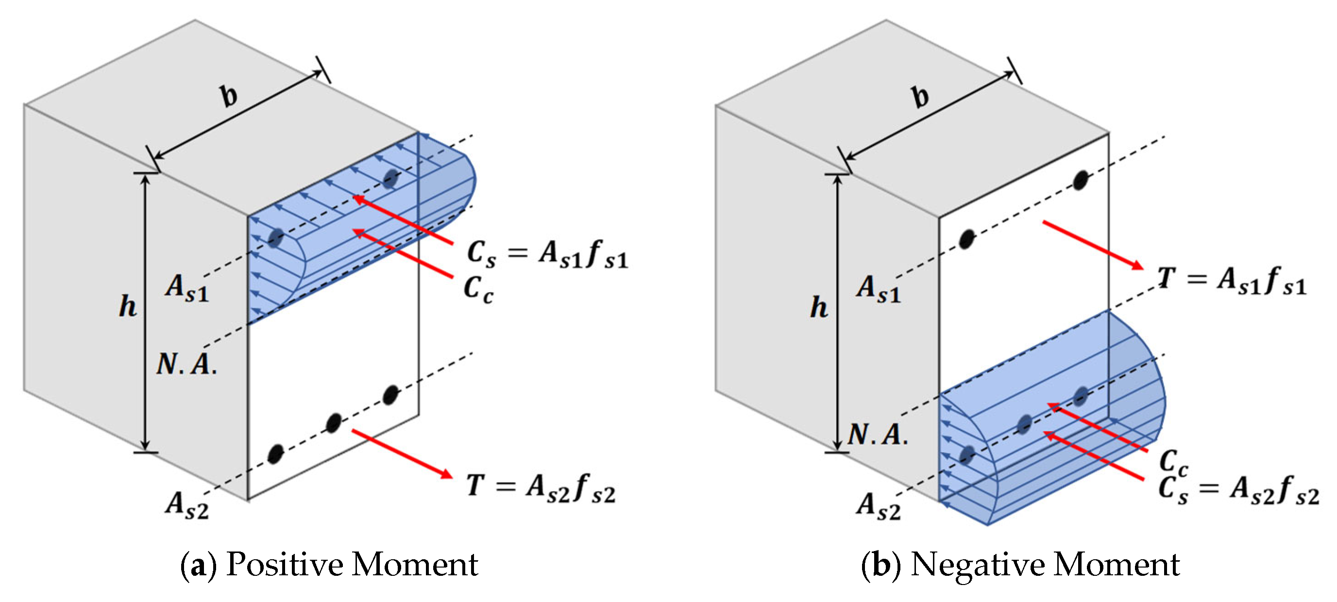 Under cyclic loading, the positions of the compression and tension zones in the beam cross-section may differ depending on positive and negative moments, as shown in Figure 3. Therefore, Vby is determined as the smaller value of the bending moments (Mb1, Mb2) in the beam cross-section from Equation (5).